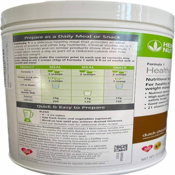 Herbalife Formula 1 Nutritional Shake Mix - Dutch Chocolate Flavour Are you looking for a tasty and simple approach to meet your dietary goals? Herbalife Formula 1 smoothie Mix in Dutch Chocolate taste is a nutritious meal replacement smoothie.About The Product:Balanced Blend: Contains protein, carbs, healthy fats, vitamins, and minerals.Low calorie: Each serving has around 90 calories, making it an excellent choice for weight maintenance.On-the-Go Convenience: Quick and simple to prepare, ideal for busy lifestyles.Delicious Taste: A delectable Dutch chocolate flavor to please your sweet taste.Versatility: Use as a meal replacement or to make healthy snacks by combining fruits and veggies.Soy-Based Protein: A high-quality soy protein isolate creates a plant-based protein.Ingredients:Benefits:Combined with portion and exercise, it helps achieve healthy weight management objectives.Offers a handy supply of important nutrients.This may help you feel fuller for longer, lowering cravings.It can be a useful tool for maintaining good energy levels.The Dutch chocolate flavor provides a delightful taste sensation.The Dutch chocolate flavor provides a delightful experience.Directions:Mix one serving (around 25g) of Formula 1 with 240ml of skim or soy milk.For optimal results, thoroughly blend or shake.Get creative! Add fruits, veggies, or Herbalife protein powder to boost flavor and nutrition.About The Brand:Herbalife is a worldwide nutrition firm creating science-backed products for over four decades. Their purpose is to give individuals the tools they need to live a healthy and active lifestyle. Herbalife goods are only available through independent distributors, who can give individualized coaching.Herbalife Formula 1- Nutritional Shake Mix -Vanilla FAQ's:1. Is Formula One appropriate for vegetarians? Yes, the soy protein source makes it appropriate for the majority of vegetarians.2. Can I use Formula 1 as a meal replacement? Yes, Formula 1 may be a healthy meal replacement when accompanied with a well-balanced diet and regular exercise.3. Are there any additional tastes available? Yes, Herbalife Formula 1 Shake Mix is available in a range of tastes to suit your preferences.Legal Disclaimer: Statements regarding dietary supplements have not been evaluated by the FDA and are not intended to diag