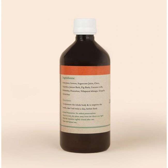 A powerful herbal formulation passed down through generations of Siddha practitioners - Jeevamritham.The meticulous process of preparing this potent potion starts with a sacred pooja, followed by some consecrated chants throughout the duration. Handmade in small batches with carefully selected ingredients, Jeevamritham is known to have healing and rejuvenating properties. A team of experienced microbiologists, chemists and Siddha practitioners ensure that each batch is of the highest quality. The Kashayam includes elements of Fig, Jamun, Amla, Lemon mixed with Coconut milk and Cow Ghee. When traditional wisdom is tapped into, true health and wellbeing come into being.Bring a balance to your system by bringing this potent potion into your life.