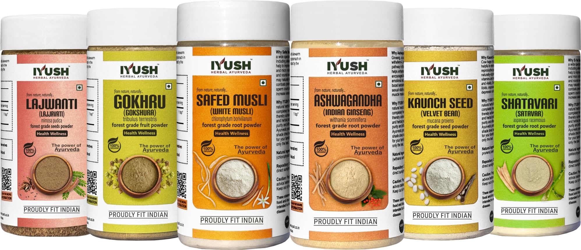 IYUSH Herbal Ayurveda Safed Musli Ashwagandha Kaunch Beej Shatavari Gokhru And Lajwanti Powder - (Total 600gm) 100gm each