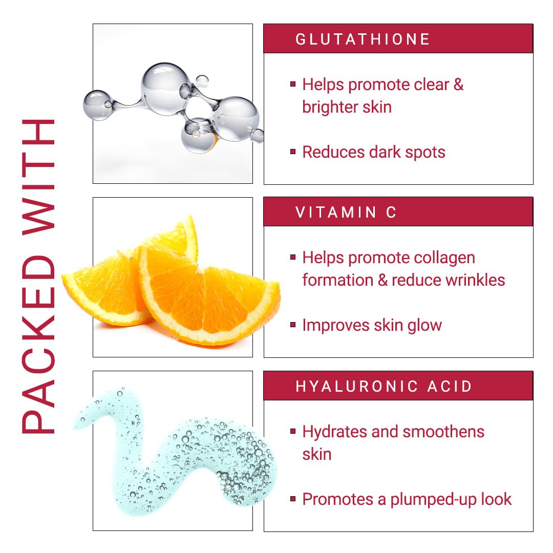 Helps improve skin radiance: Glutathione along with Vitamin C are powerful antioxidants that reduce oxidative stress and help the skin become more radiant and clear.