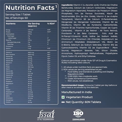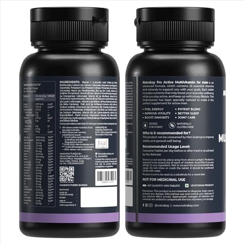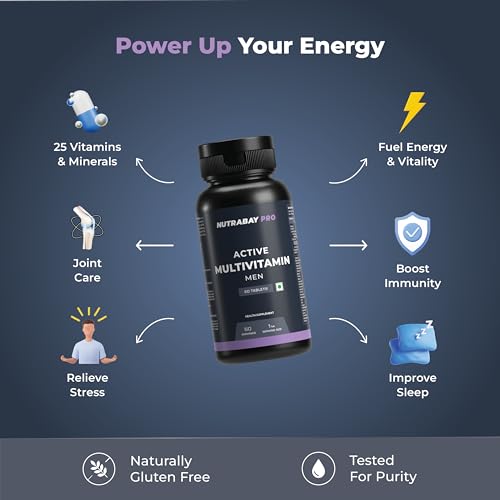 Immunity Booster : Nutrabay Pro Active Multivitamin Men is super packed with 25 Vitamins & Minerals which helps in building Stamina Energy and Immunity that keeps our body active all day. Vitamin E & Vitamin C are added to support Healthy Hair Skin & Nails. Calcium Magnesium & Vitamin D are added to support healthy Bones & Joints. Maintain Energy Levels : Vitamin B1 B2 B6 B5 & Iron supports an active lifestyle by improving energy. Improves Vitality : Biotin Zinc Calcium Magnesium Vitamin D Vitamin C Copper B12 and Selenium helps in promoting Muscle Strength and tissue repair. Nutrabay Pro Multivitamin Capsules are 100% Veg Consume 1 Capsule daily or as prescribed by your healthcare professional to avail its multiple benefits.