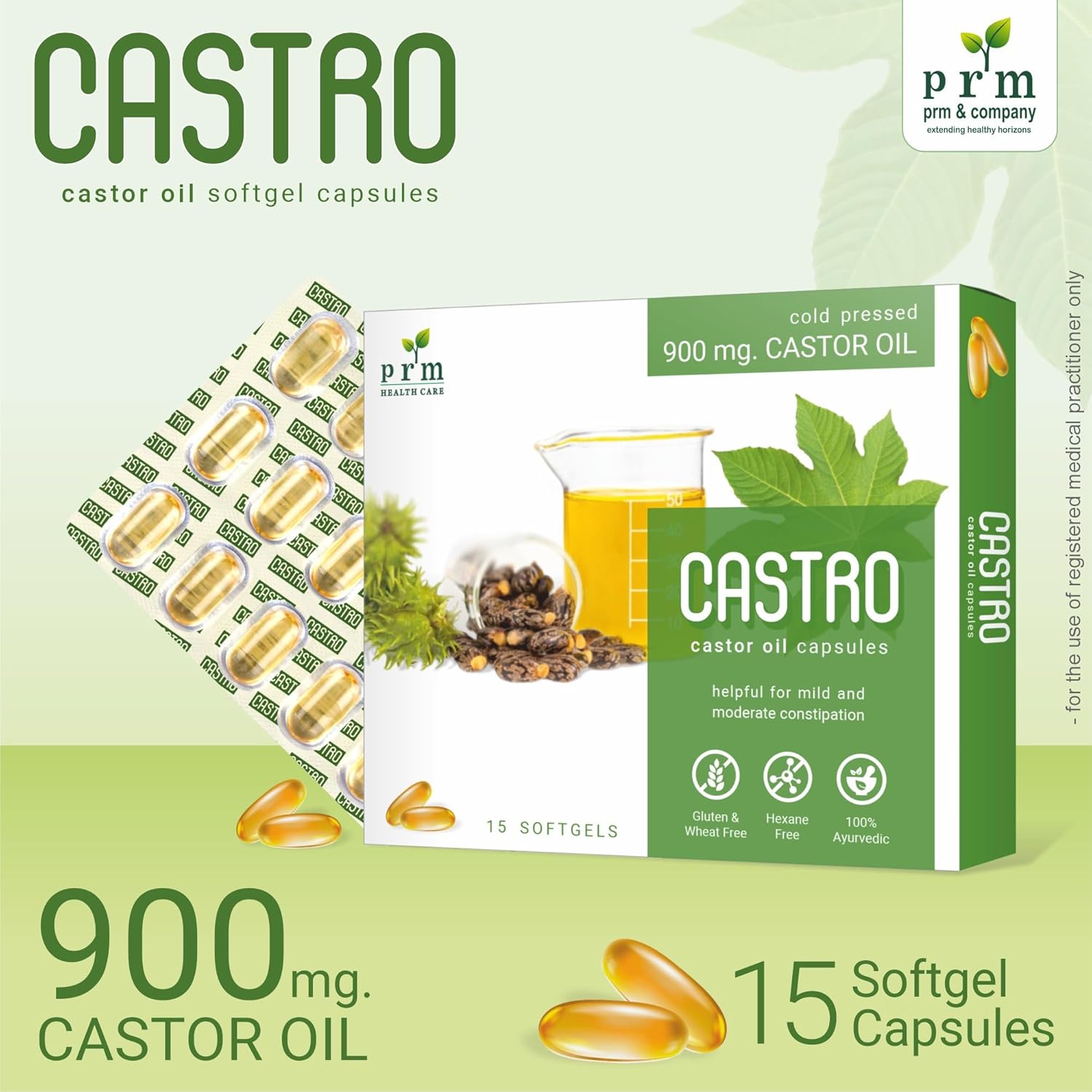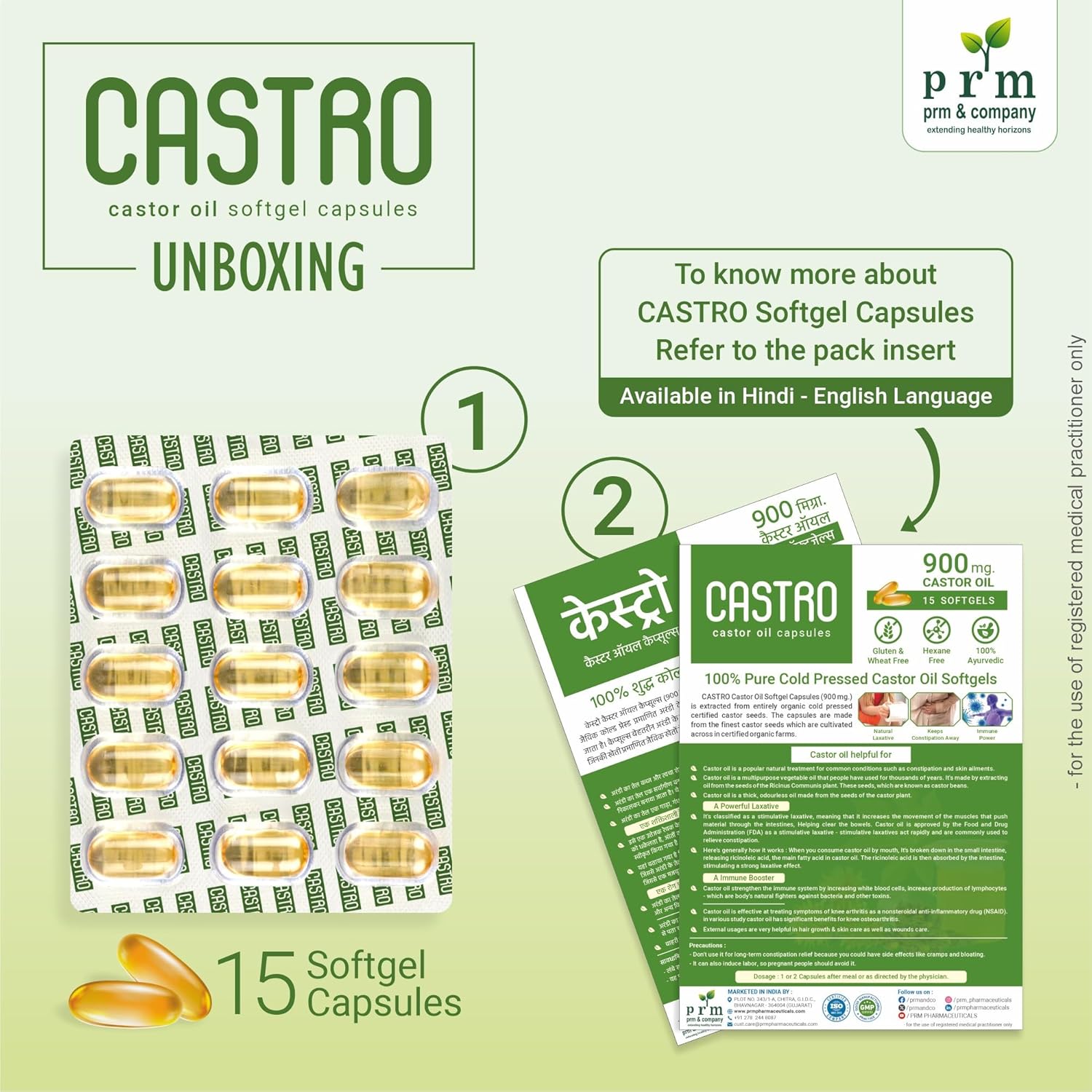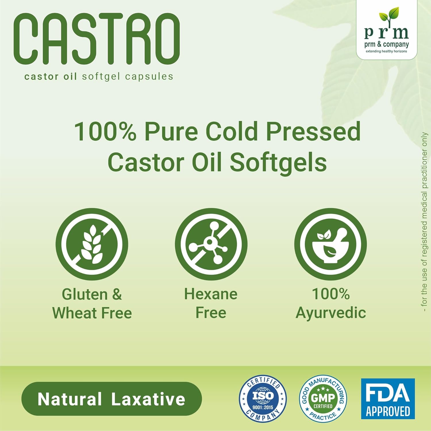 CASTRO Castor Oil Softgel Capsules (900 mg.) are extracted from entirely organic cold pressed certified castor seeds. The capsules are made from the finest castor seeds which are cultivated across in certified organic farms.