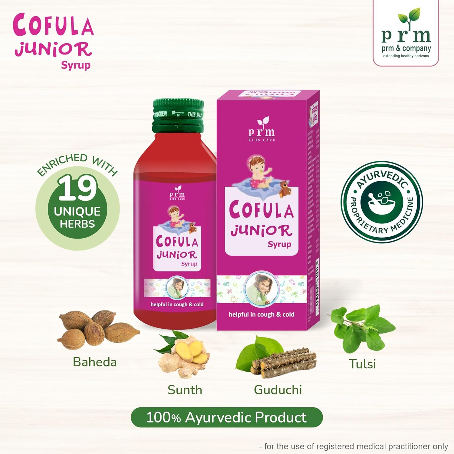 PRM & Company present to you a 100% authentic ayurvedic cough syrup for children and infants - Cofula Junior. Cofula junior syrup gives instant relief from cough, cold, sneezing, sore throat and normal fever. Cofula junior syrup enriched with 20 natural herbs namely Tulsi oil, Nilgiri Oil, Vasaka pan, sunthi rhizome, Haldi rhizome and more