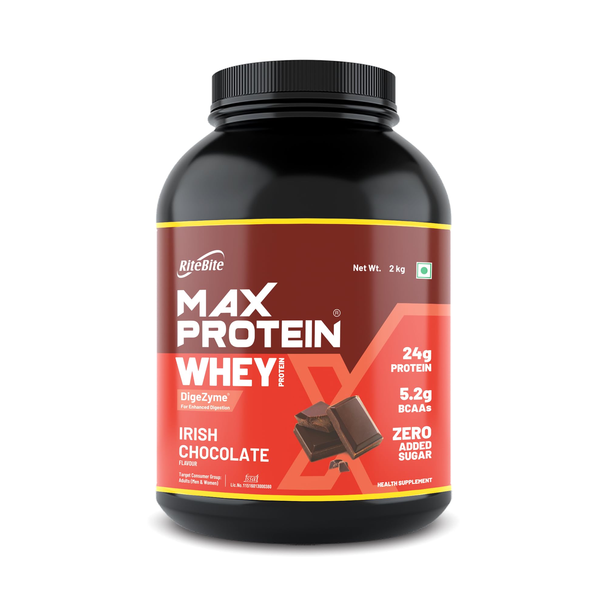 RiteBite Max Protein Whey Protein Irish Chocolate 2Kg| 60 Servings| DigeZyme for Enhanced Digestion | 25g Protein | 5.2g BCAAs | Zero Added Sugar | For Adults (Men & Women) | High Protein| Gluten Free| 100% Vegetarian