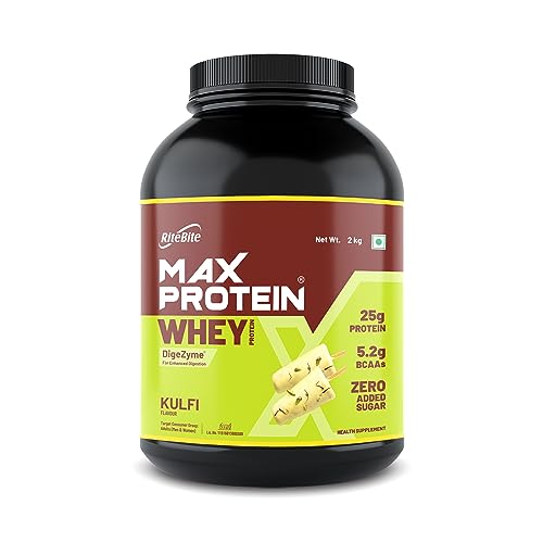 RiteBite Max Protein Whey Protein Powder Kulfi 2Kg| 60 Servings | DigeZyme for Enhanced Digestion | 25g Protein | 5.2g BCAAs | Zero Added Sugar | For Adults (Men & Women) | High Protein| Gluten Free| 100% Vegetarian