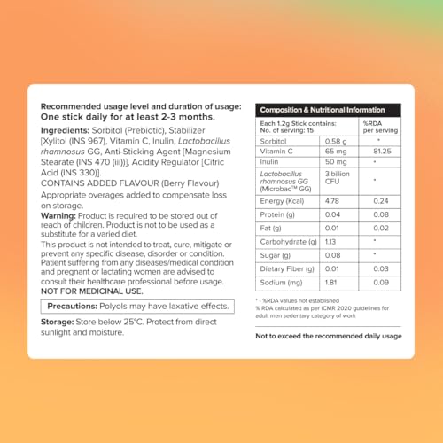 • STRENGTHEN DIGESTION & RESTORES GUT India’s first-of-its-kind Synbiotic stick with a unique formulation of precision probiotic strains of Lactobacillus bacteria Inulin & the goodness of Vitamin C that will repopulate your gut with healthy bacteria stren