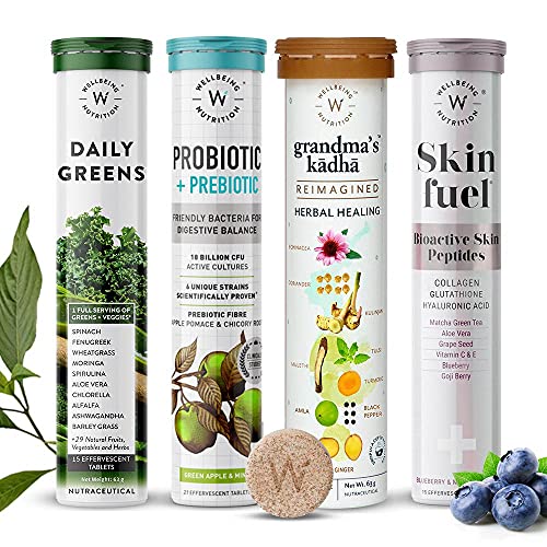 Wellbeing nutrition daily greens - organic plant superfood effervescent tablets are the most convenient and delicious way to get a daily dose of greens fruits veggies and herbs. Crafted with an organic blend of 15 essential and alkalising real greens straight from the farm. Spinach kale aloe vera wheatgrass brussel sprout alfalfa oregano spirulina chlorella broccoli ashwagandha moringa basil and potent blend of over 30+ antioxidant-rich superfoods including blueberry raspberry cherry apple acai turmeric cinnamon green tea carrot green coffee bean and many more. Wellbeing nutrition grandmas kadha organic and pure ayurvedic ayush kwath kadha / herbal tea immunity boosting tea with a potent ayurveda approved dose of 100% natural herbs echinacea tulsi curcumin rich turmeric kalmegh vitamin C amla mulethi ginger to help combat sore throat congestion cough cold. Our ayurvedic tea is delicious with zero bitter aftertaste. Wellbeing nutrition probiotic + prebiotic supplement supports intestinal health with a blend of 6 probiotic strains to support a healthy digestive tract & prebiotic fiber apple pomace and chicory root (inulin) that nourishes your gut's good bacteria to keep things balanced and offer optimal digestive balance. Wellbeing nutrition skin fuel is a dermatologist formulated beauty clear skin hydrator supports smooth luminous and nourished skin.