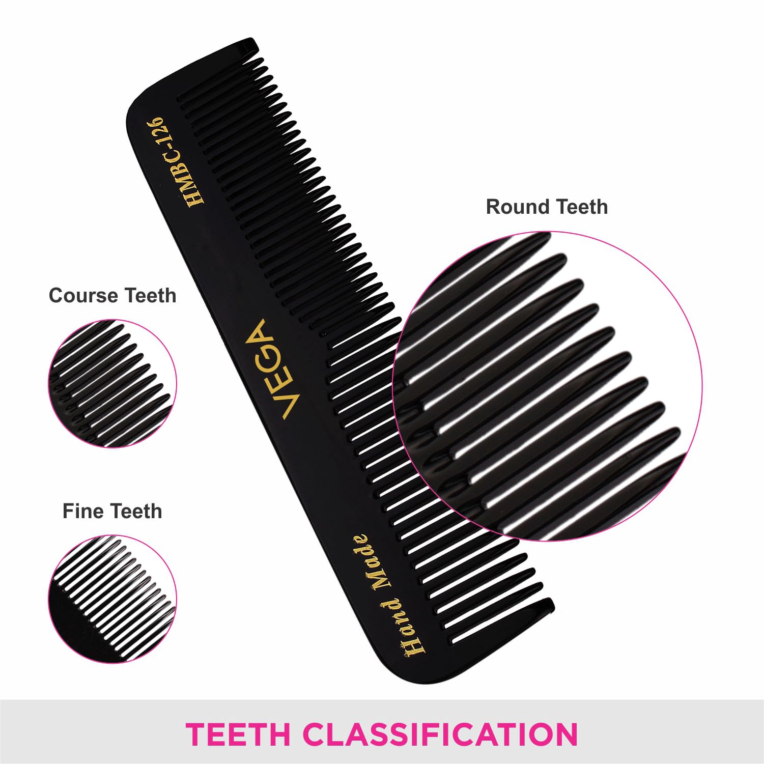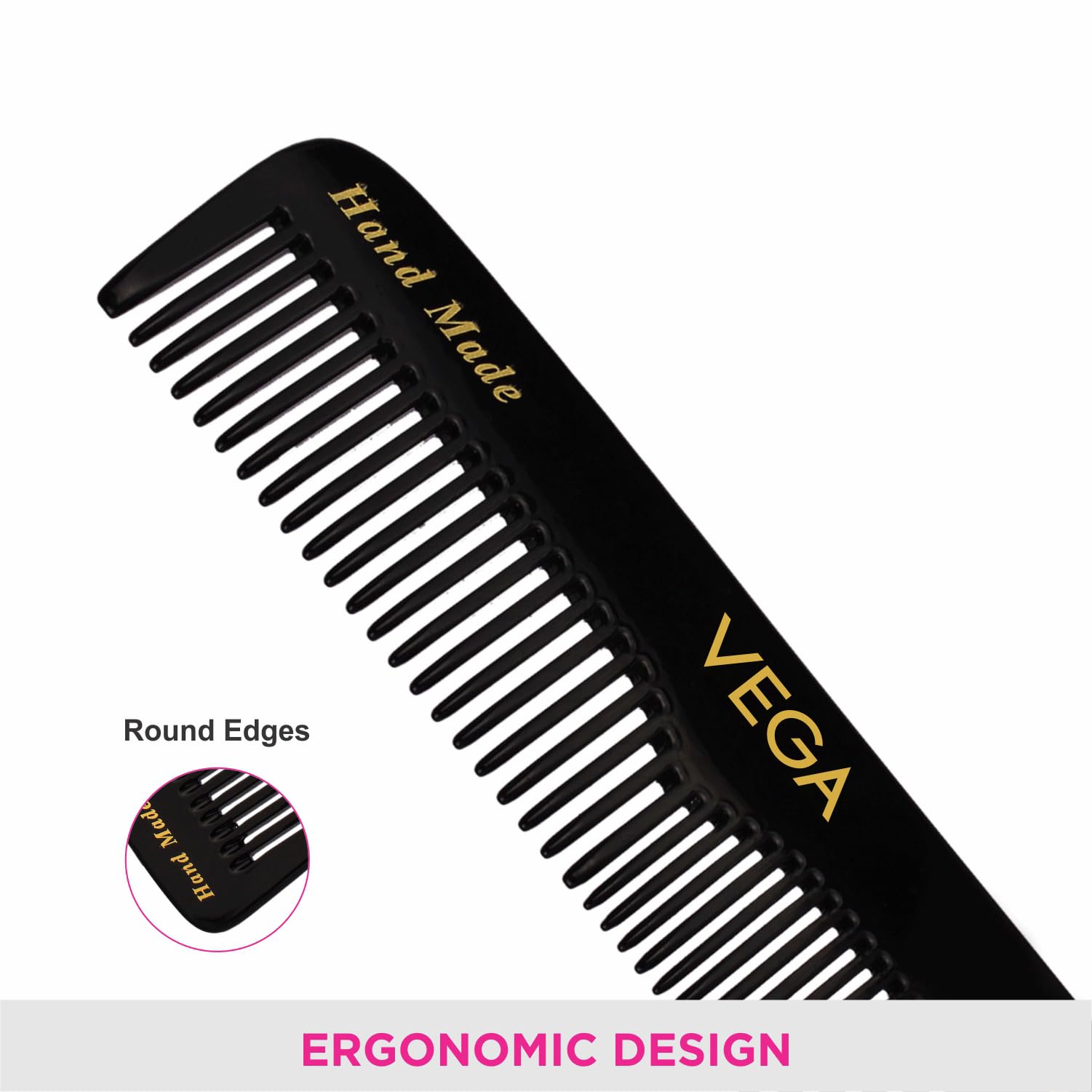 Vega handcrafted black combs are made from cellulose acetate which do not create static charge in hair due to its nonpetroleum based material which is derived from natural plants. It has smooth rounded teeth which do not hurt your scalp while combing and helps to reduce hair fall. It is gentle on scalp and ideal for sensitive skin. Perfect for salon professionals useful for grooming and styling hair and adding lustre.
