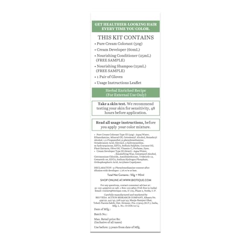 The nature and science are in complete harmony now. This innovative cream colour system blend 21st century technology with the purest pigments and most beneficial botanicals grown in the Himalayas. Discover everything you need to silken and shade your hair with healthy-looking colour and shine. This kit contains pure cream colorant (50g) cream developer (60ml) nourishing conditioner (25ml) (free sample) nourishing shampoo (25ml) (free sample) 1 pair of gloves usage instructions leaflet herbal enriched recipe (for external use only) take a skin test. We recommend testing your skin for sensitivity 48 hours before application. Organically pure & preservatives free. Dermatologist tested for safety.