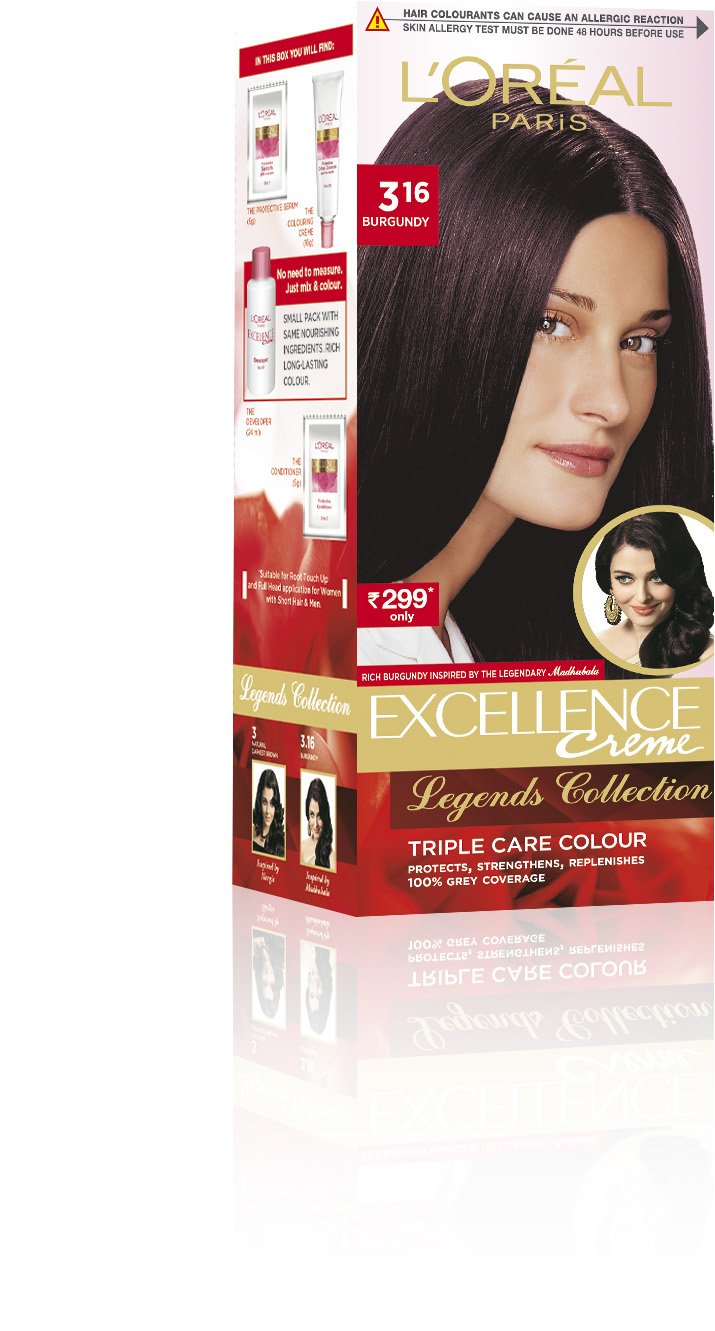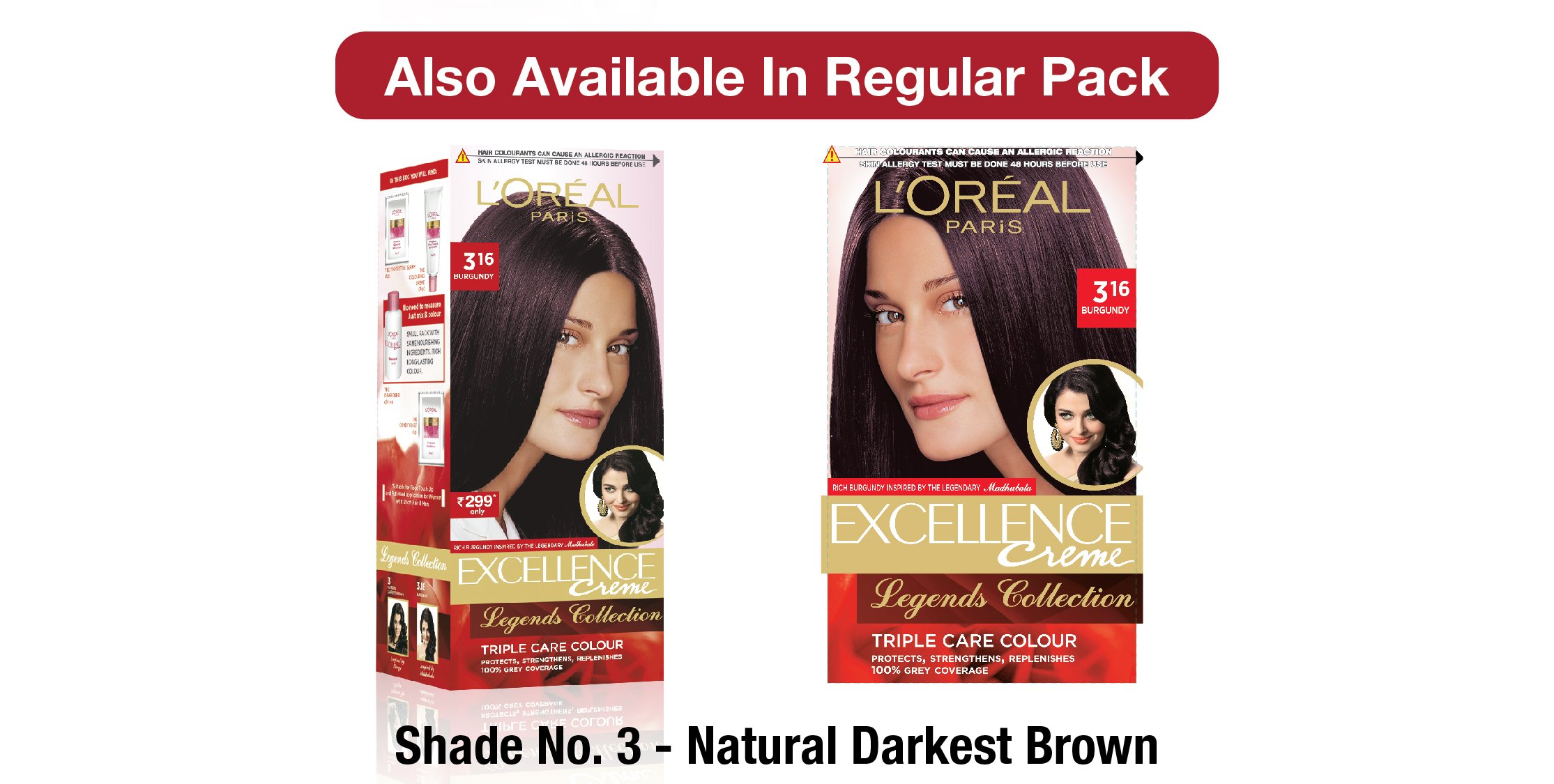 Product DescriptionLoreal Paris excellence me pays tribute to legendary icons of bollywood. Each of these legends are known for their legendary beauty characteristic/distinctive hairstyles and iconic personalities.From the Manufacturer THE EXCELLENCE CREME RANGE: RICHEST CARE FOR RICHEST COLOUR LOreal Paris Excellence Creme gives the richest care for the richest colour. Over the last 20 years Excellence Creme has been part of womens life and consistently reinvented its formula as an expert; always more efficient with more care. Infused with its triple care formula: an advanced technology concentrating on 3 powerful ingredients strengthen your hair while colouring leaving it softer and protected and giving you 100% grey coverage from root to tip! THE SECRET OF THE FORMULATION OF EXCELLENCE CRoME PRO-KERATIN STRENGTHENS CERAMIDE PROTECTS COLLAGEN REPLENISHES AN EXTENSIVE RANGE OF SHADES CLASSIC BLACK NATURAL BROWNS STYLISH BURGUNDY SPECIAL BROWNS RECREATE THE MAGIC WITH THE LIMITED EDITION EXCELLENCE LEGENDS COLLECTION As times change so do trends but some styles are eternal and some hair colours legendary. Just like Nargis and Madhubala. Two iconic beauties whove inspired L'Oreal Paris to recreate their timeless magic in shades just as timeless with the Excellence Legends Collection. Reliving their legacy is none other than Aishwarya Rai. Styled in Natural Darkest brown Shade 3 and Burgundy Shade 3.16 she personifies the art of elegance. With shades that beautifully complement Indian skin tones these hair colours are the classic transformation your hair deserves. BEAUTY ADVICE FROM OUR EXPERTS: CHRISTOPHE ROBIN LOREAL PARIS EXPERT COLOURISTI recommend Excellence to women who want ultimate grey coverage and intense care for their hair. I love Excellences colours for their richness of tones and their radiance. They are always very flattering to womens skin tones. His application tips for best results: Always use the Protective serum which conditions lengths and dry ends intensely nourishes and allows an even result without a block-colour effect. If you are deciding between 2 shades of Excellence Creme choose the lighter. Always consider that results will vary depending on your natural colour. SAFETY AND CARE ADVICE FROM LOREAL PARIS You must always do a skin allergy test without fail 48 hours before each use of this product. Do not use if you have previously experienced a reaction to a hair colourant or have an irritated or damaged scalp. If you have ever had even once a black henna tattoo you may have become allergic without knowing. You must do a skin allergy test 48 hours before use. Always follow the instructions leaflet. BEAUTY TIPS FOR FABULOUS HAIR COLOUR Use products specially formulated for coloured hair LOreal Paris Colour Protect is a complete range of products (shampoo and conditioner) specially developed to prolong the shine of your colour after washing. Excellence Creme is also ideal for covering highlights. It is advisable to put a little moisturizer cream on the skin and hair line to easily wipe away any splashes.