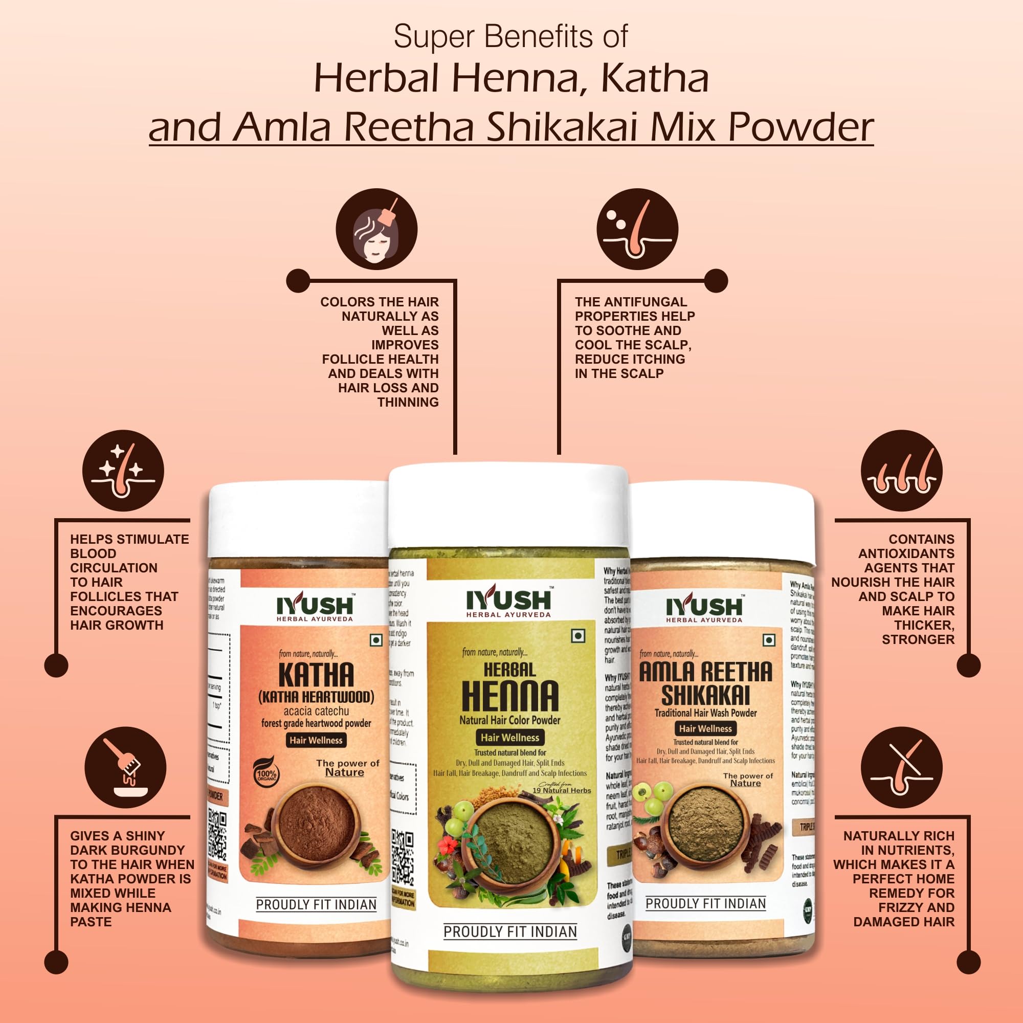IYUSH Herbal Ayurveda Amla Shikakai Reetha Powder for Hair with Katha Powder and Herbal Henna Powder for Hair Colour 300gm | Herbal Hair Wash Powder | Hair Volume Powder | Hair Powder | 100gm each