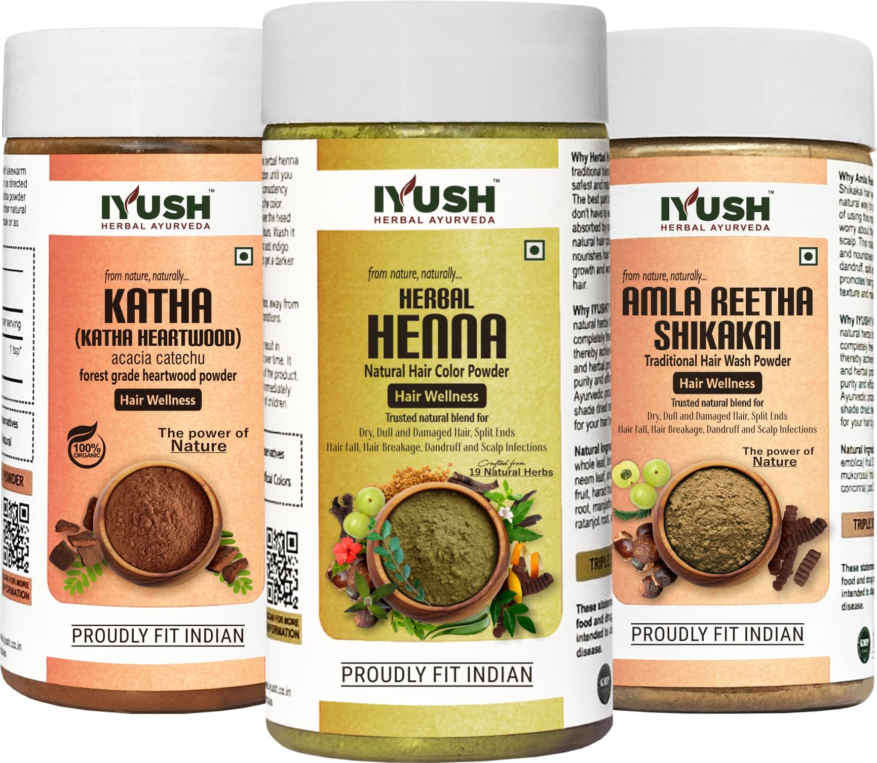 IYUSH Herbal Ayurveda Amla Shikakai Reetha Powder for Hair with Katha Powder and Herbal Henna Powder for Hair Colour 750gm | Herbal Hair Wash Powder | Hair Volume Powder | Hair Powder | 250gm each