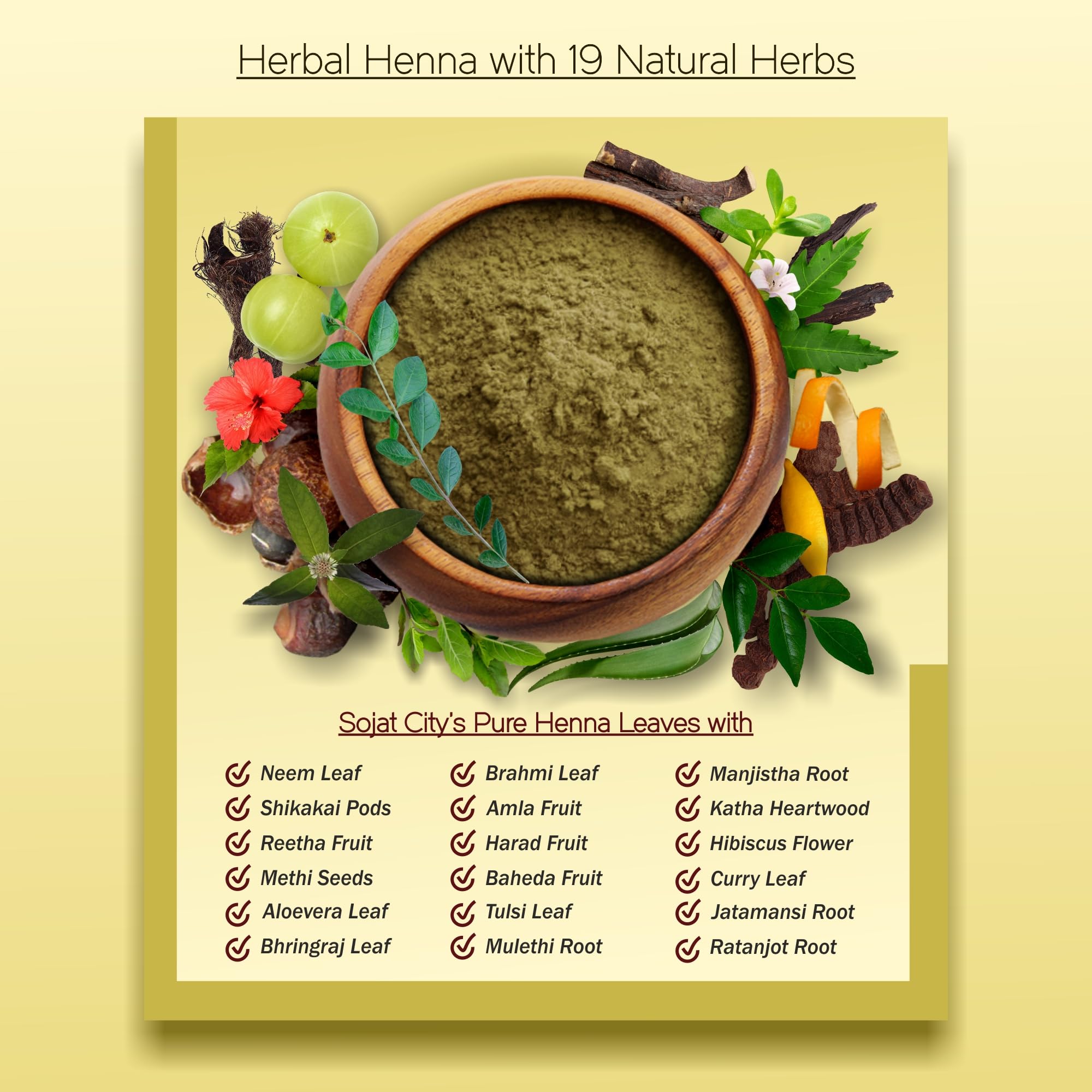 • Herbal Mehndi for Hair Nourishment: It is an ancient and traditional blend of 19 potent natural herbs like Amla Reetha Shikakai Bhringraj Hibiscus Brahmi Methi Tulsi Neem Aloevera Mulethi Triphala Manjistha Jatamansi Katha etc. mixed in unique proportions