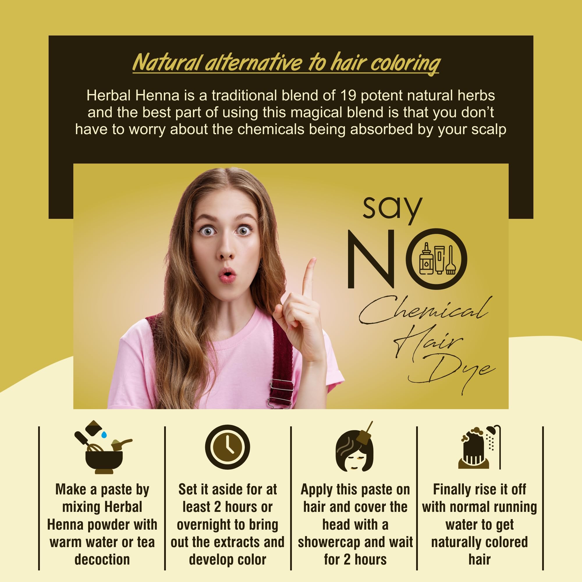 Natural Hair Dye: Herbal Henna Powder is popular and natural alternative to chemical based hair dye as it colours hair strands naturally to give them a darker shade.