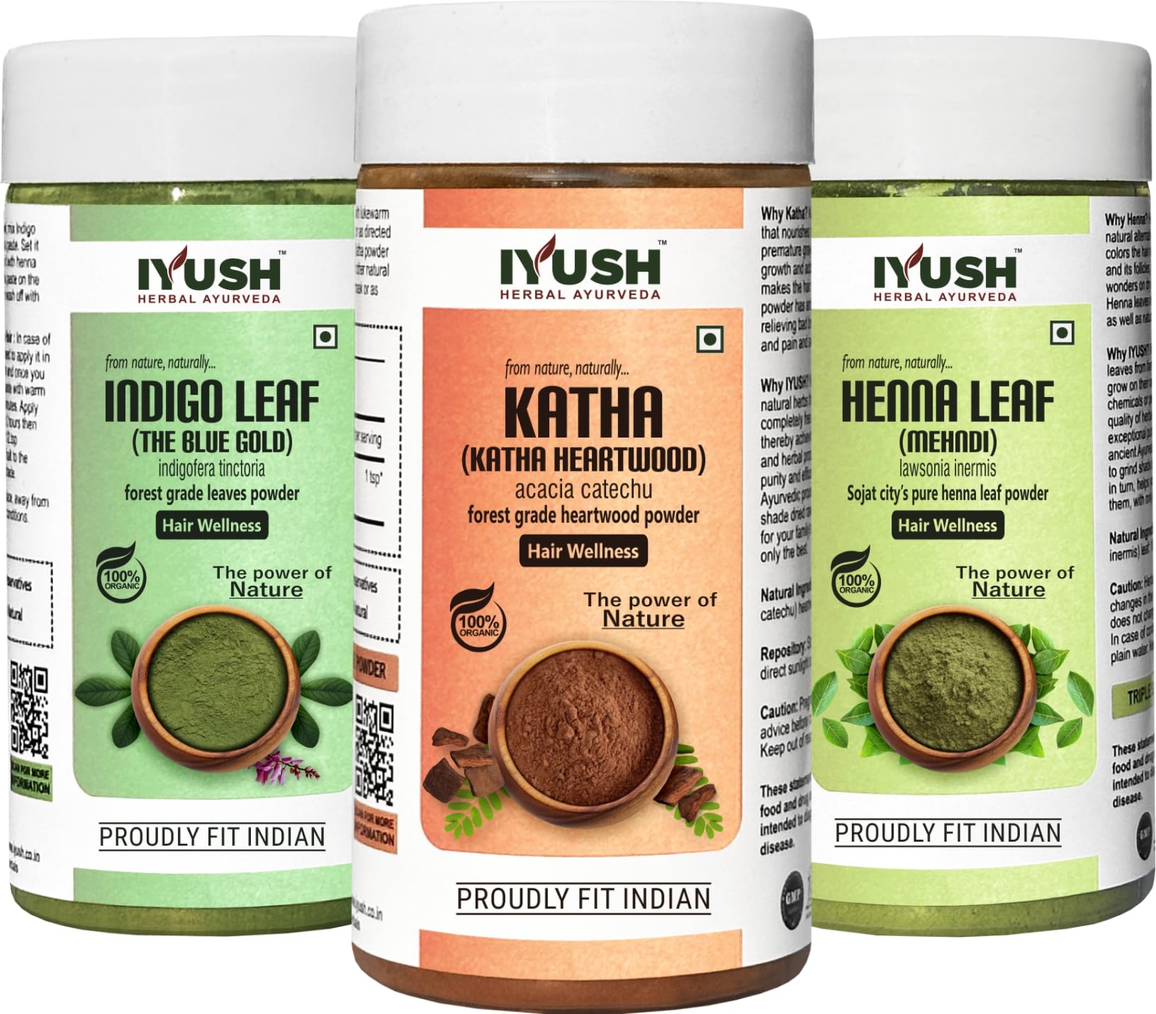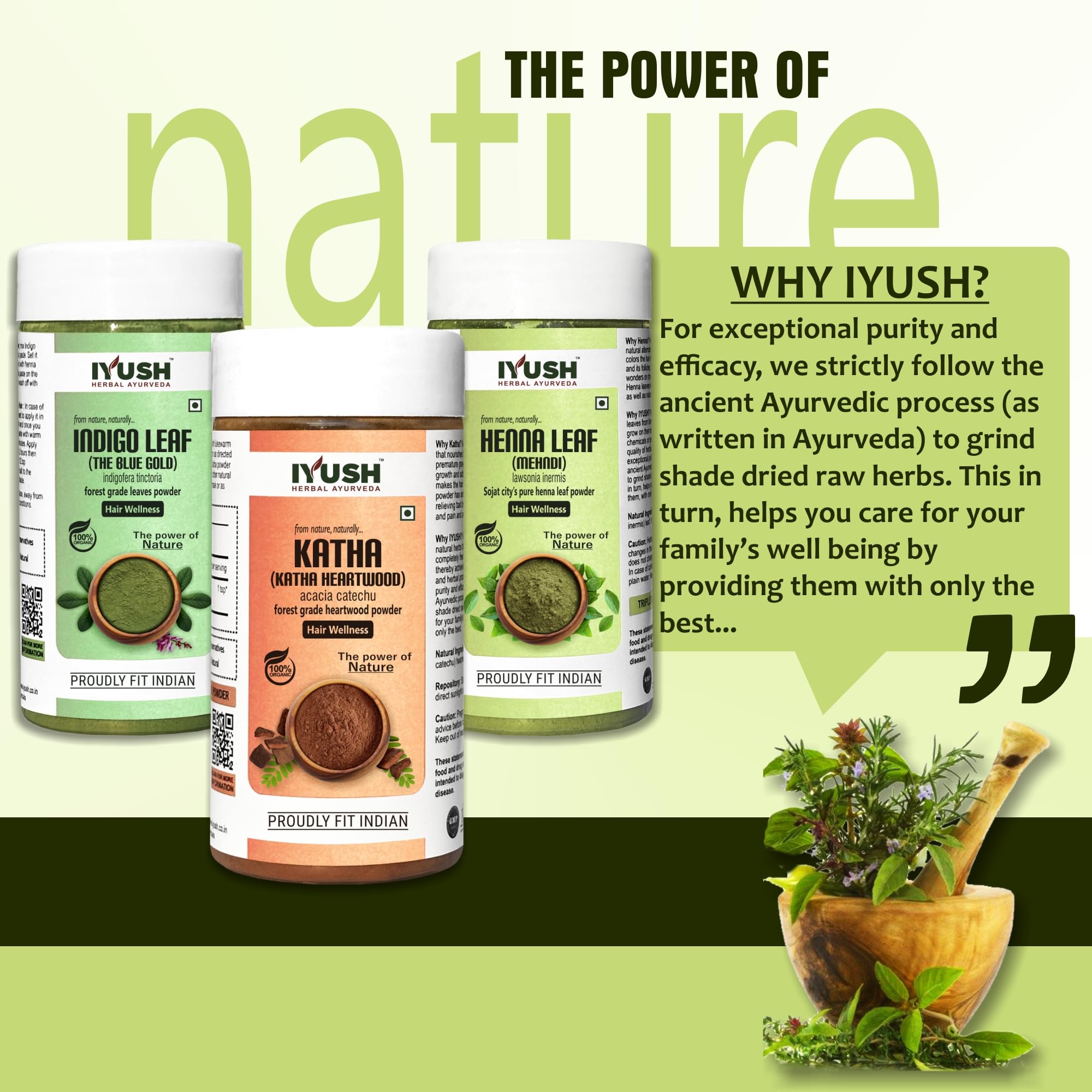 IYUSH Herbal Ayurveda Indigo Powder with Katha Powder for Hair and Henna Powder for Hair Colour 750gm | Natural Hair Colour | Hair Mask for Dry and Frizzy Hair | Hair Volume Powder |250G each