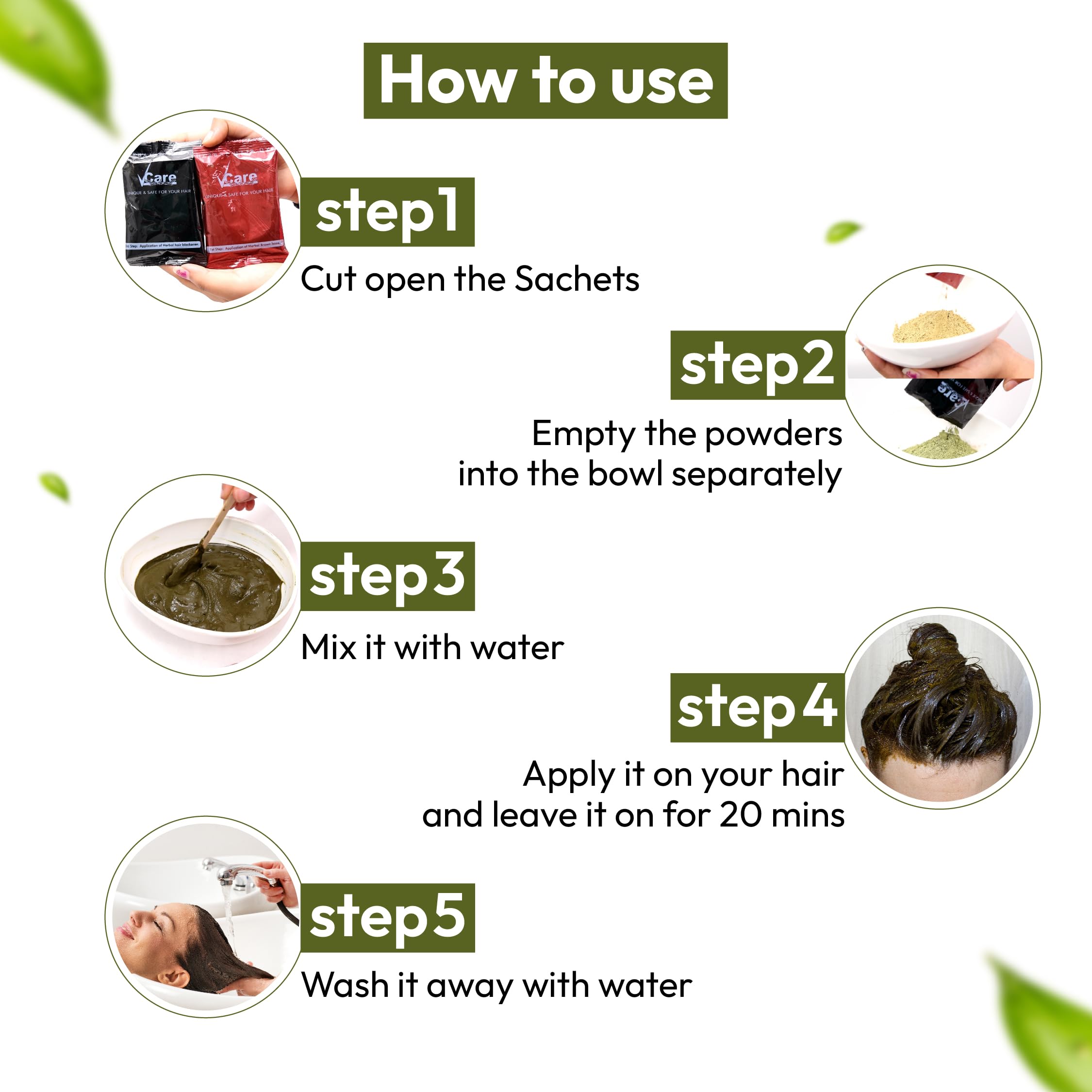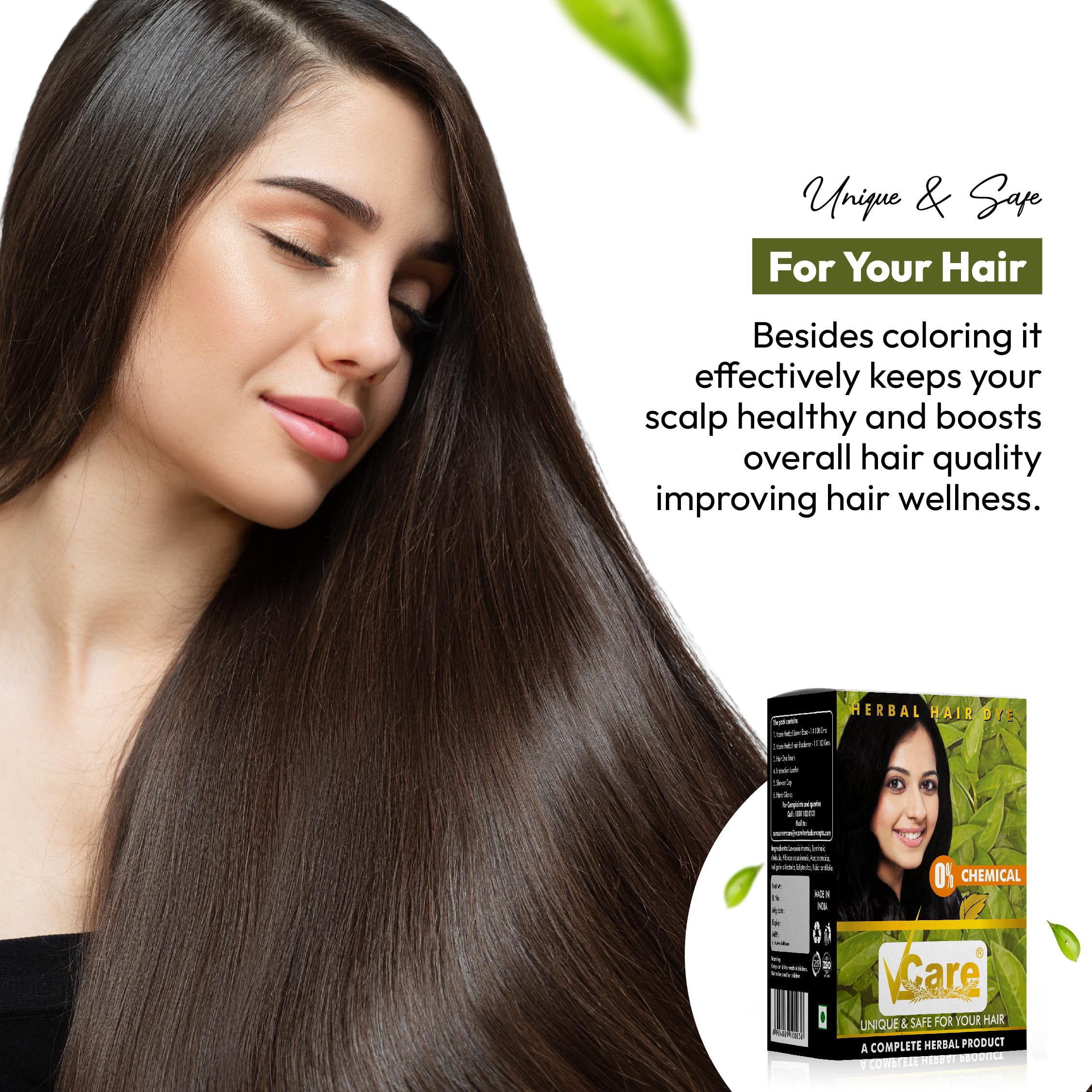 • EASY APPLICATION: VCare Herbal Hair Dye is incredibly easy to use. Mix the powder and apply it on your hair with the gloves provided. Leave it on for 15 min and wash it off. It adds a natural looking color to your hair.