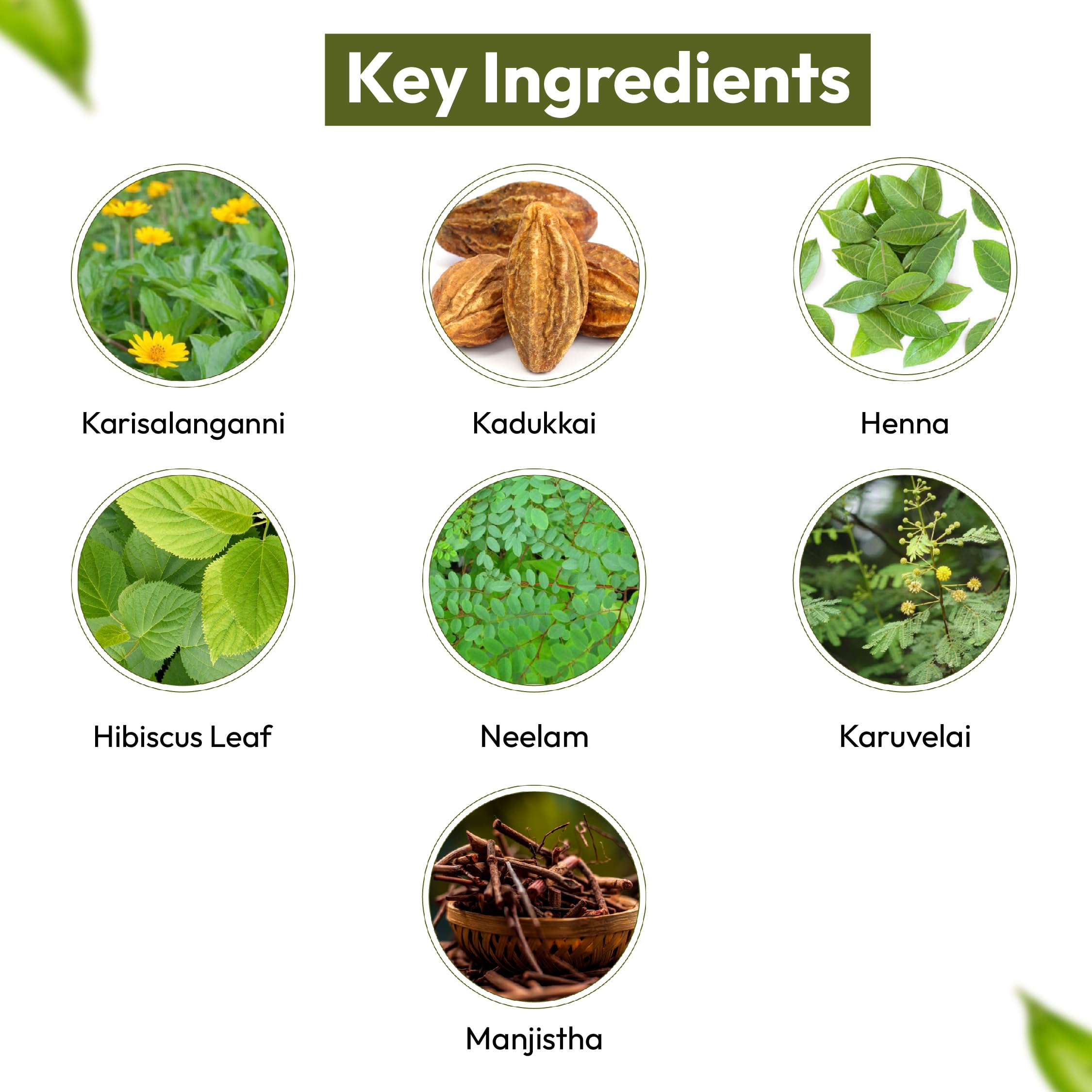 • CONTAINS INGREDIENTS FOR HAIE GROWTH: It contains a unique blend of natural ingredients such as Henna Kadukkai Hibiscus Leaf Karuvelai Neelam Manjistha Karisalankanni which not only colors your hair but also cares for it promoting strength and shine.