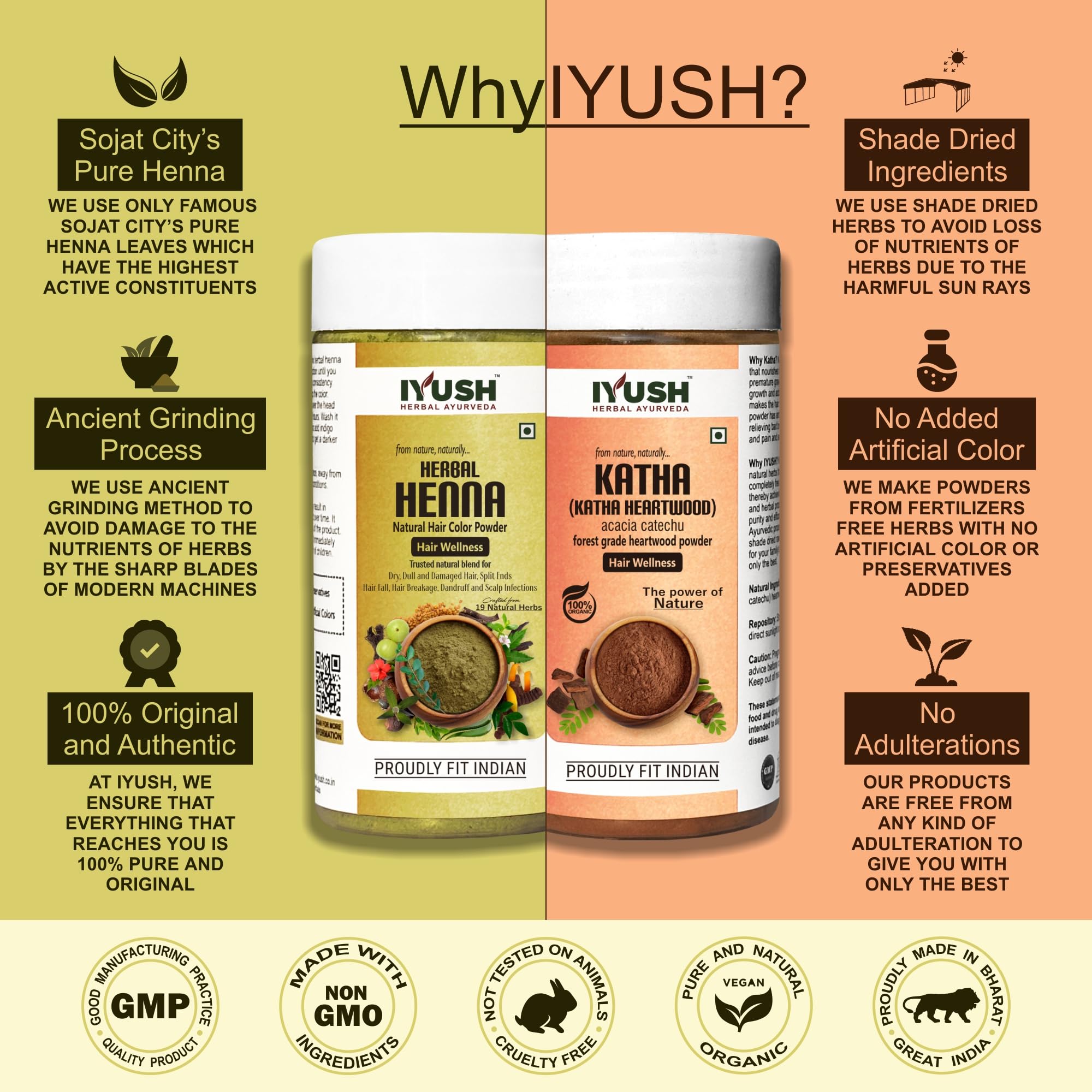 IYUSH Herbal Ayurveda Herbal Mehndi for Hair Color and Katha Powder for Hair 500gm | Natural Hair Colour without Chemical | Herbal Hair Colour | Hair Volume Powder | Hair Powder | 250gm each