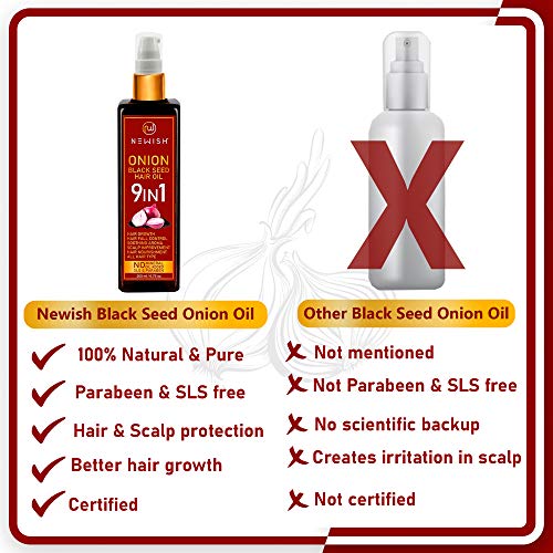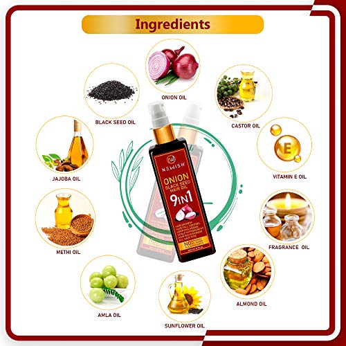 Newish: Our onion hair oil gives your hair the necessary nourishment to help fight hair and scalp problems. It is a nutrient-rich oil that provides soothing care to dull lifeless weak hair and tired scalp to help transform their texture and health. It contains a blend of 7 -pressed oils like Sweet Almond Oil Extra Virgin Olive Oil Castor Oil Jojoba Oil Moroccan Argan Oil Coconut Oil and Onion Black Seed oil. The -pressed process helps preserve goodness. Pressed extraction protects its nutritional integrity from high temperatures or harmful chemic. It keeps the oil natural unharmed and pure which makes hair 10X stronger and more resistant to hair fall. It keeps the oil natural unharmed and pure which makes hair 10X stronger and more resistant to hair fall. Regular head massage with warm oil helps improve circulation in the scalp. Apply this oil on the hair strands to smooth down and seal the cuticles and restore the hair's natural shine and softness. Use this oil to help tame frizz hair fall repair damaged strands and texture and shine. It is hexane-free non-sticky and non-greasy hair oil. It is fast-absorbing and gets easily soaked into the scalp. Suits all hair types. Moisturizing and shine-enhancing hair oil Get strong and lustrous hair with Newish Onion Black Seed Hair Oil. This hair oil works to condition your weak strands and moisturize your scalp. Light non-sticky hair oil can be used on very curly and dry strands after shampoo as a serum and hair protector. Regular use helps to improve hair texture and strengthen the strands. Regular use of black seed red onion hair oil helps to grow hair faster almost 4 to 6 weeks for complete hair growth. Our onion hair oil has 99.9% natural hand-picked ingredients that are known to hair fall.