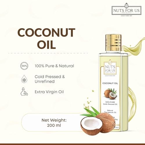 Nuts For Us Coconut Oil Pack of 1 is a natural cold-pressed oil derived from handpicked and hand sorted coconuts. Our philosophy of source to skin at Nuts For Us is embodied in our range of cold-pressed oils. Our cold-pressed Coconut Oil is derived with a method to retain to all natural and nourishing properties of the coconuts. Our oil is undiluted preservative free chemical free with no additives and no fragrance added. Our oil is certified and edible. Quantity is 100ml Form Sold is Liquid Made in India Cold Pressed Edible Coconut Oil. Vegetarian It is a natural cold-pressed oil derived from handpicked and hand sorted dried coconuts. Our oil is undiluted preservative free chemical free with no additives and no fragrance added. Consumption of one teaspoon of coconut oil every morning to improve digestion and boost energy levels for throughout the day. This oil improves skin complexion and tone while reduces signs of aging. It can be used to prevent stretch marks during pregnancy and for others with dry skin syndrome. It can be used as a natural makeup remover and a night cream for medium to dry skin. It can be used as deep conditioner for hair. It enhances hair quality and boosts hair growth.oil is undiluted preservative free chemical free; It has no additives and fragrance. Nuts For Us Cold Pressed Sweet Almond Oil sourced from the finest almonds this pure natural badam tel is rich in vitamins antioxidants and essentil fatty acids that provide a multitude of benefits. Perfect for hair growth radiant skin and therapeutic massage this almond oil is a must-have in your self-care routine. Nuts For Us Cold Pressed Sweet Almond Oil (200ml) comes in a pack of 2 ensuring you have enough to enjoy long-lasting benefits. Use it for daily hair care massage therapy or as a natural face and body moisturizer for healthier glowing skin.