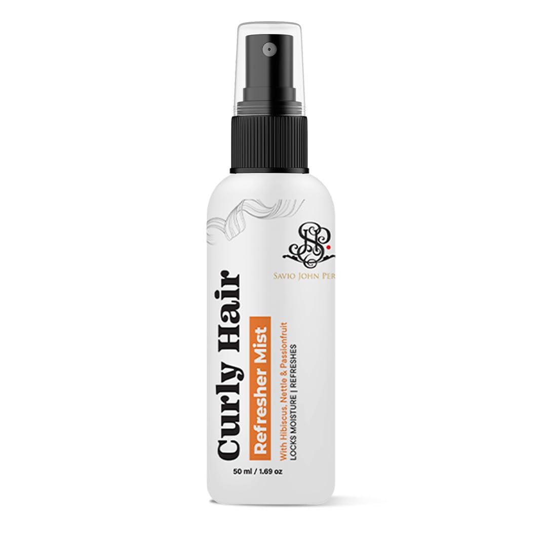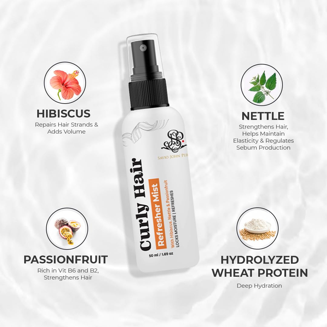 Curly Hair Refresher Mist | Wavy and Curly hair products | Travel Friendly Minis | Hair Spray for Curly wavy hair | Hydration Nourishment and Protection | Enriched with Passionfruit Hibiscus Nettle | Magic hair care for curls | By Bollywood Hair Stylist Savio John Pereira - 50ml