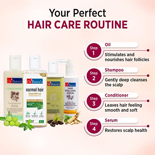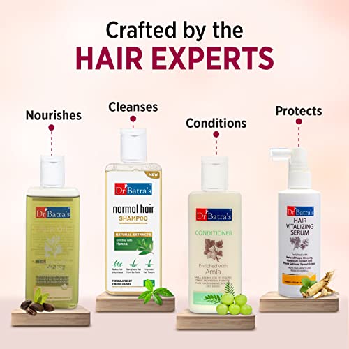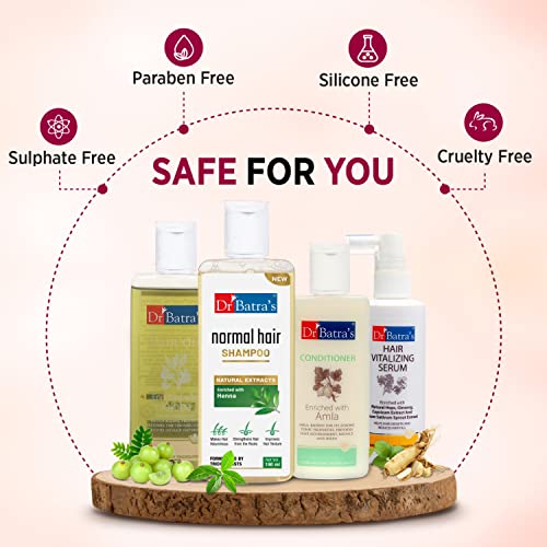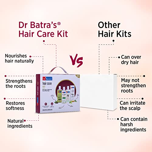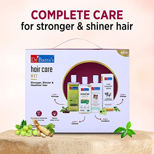 "Dr Batras range of hair care products are carefully formulated with gentle ingredients to provide stronger shinier and healthier hair. Dr Batras Hair Kit includes hair oil shampoo conditioner and hair vitalizing serum. This 4-in-1 hair care kit is crafted to give you the perfect daily hair care regime. It helps to strengthen the hair follicles restore scalp health and improve hairs texture while leaving hair nourished from root to tip. Elevate your daily hair care ritual with this easy to follow 4-in-1 hair care kit."