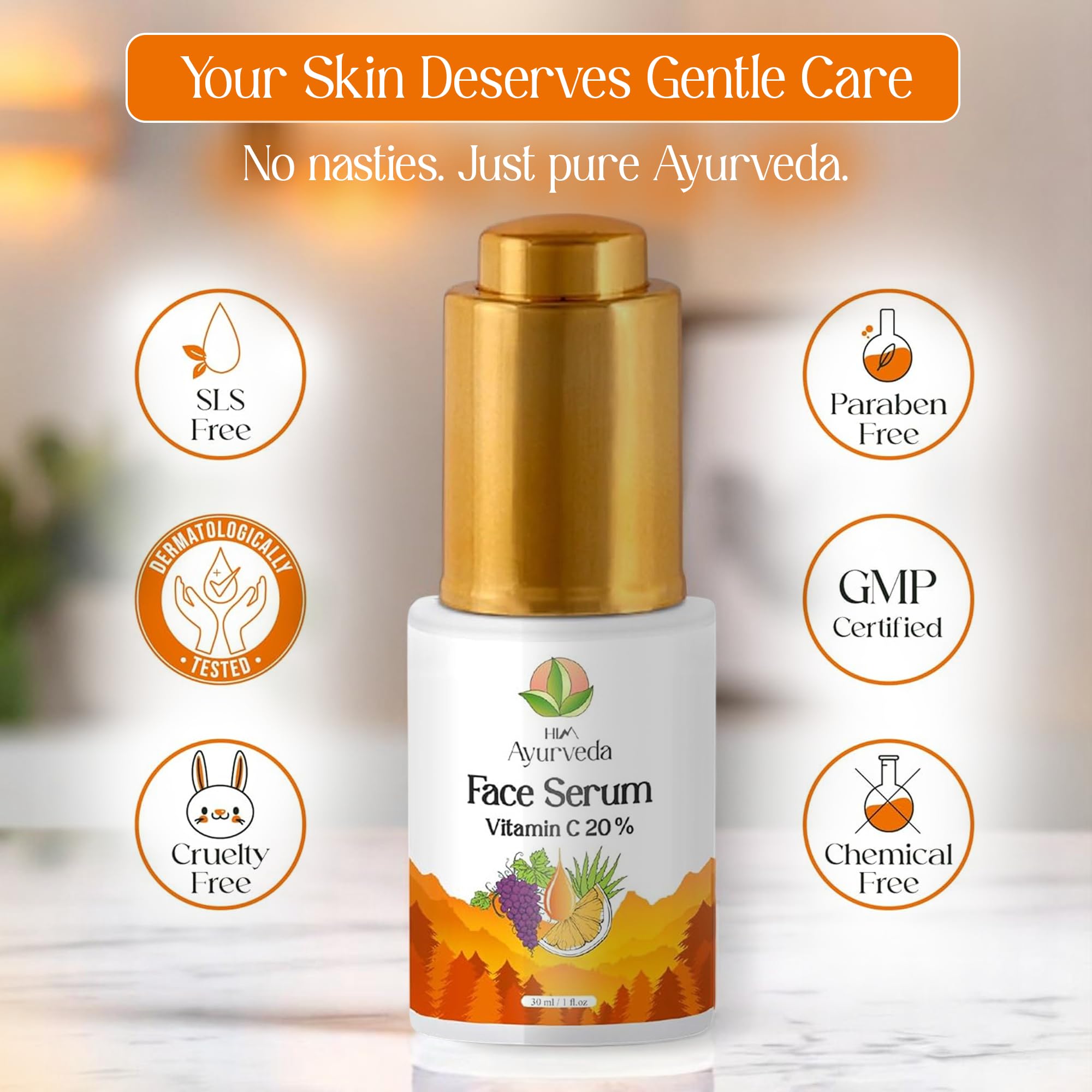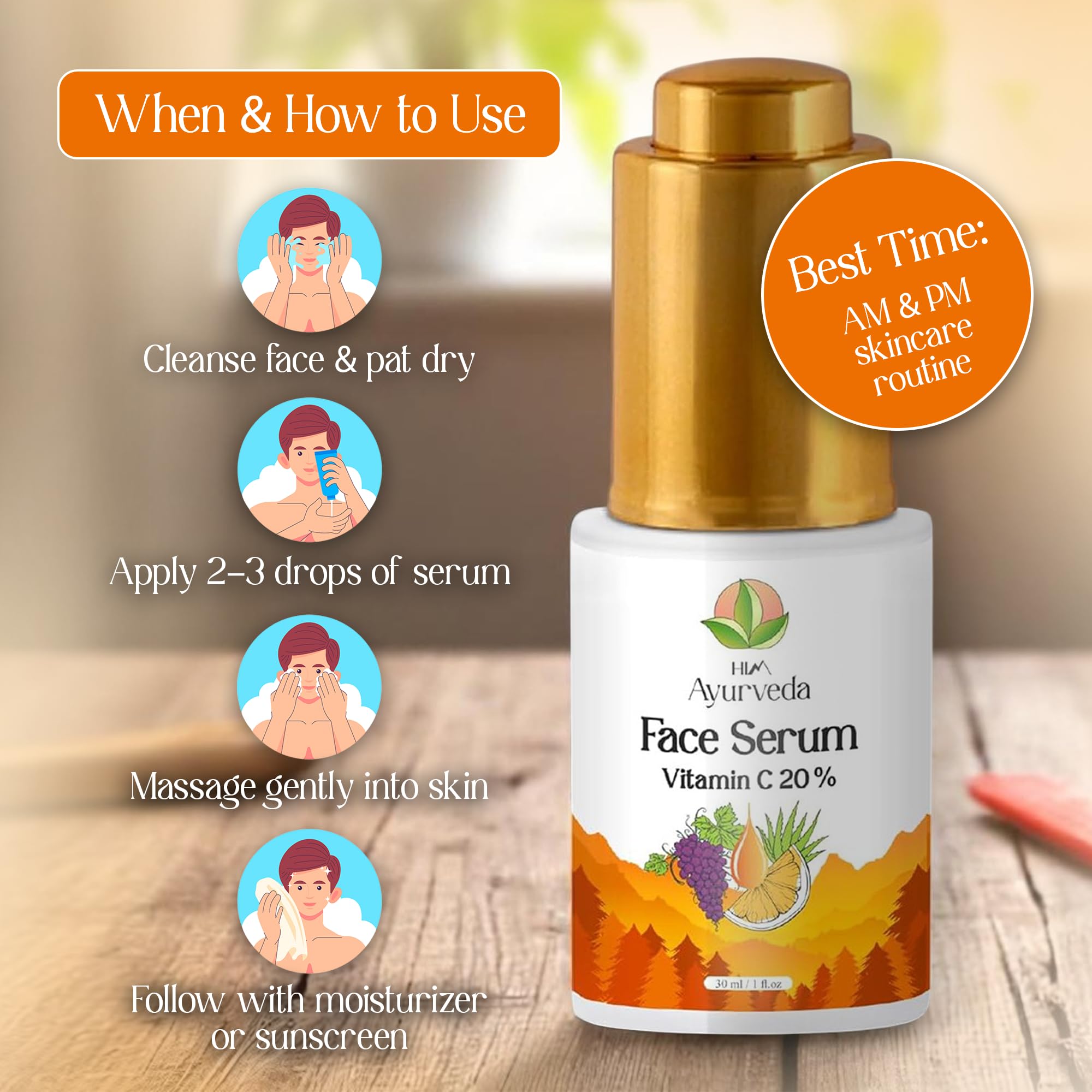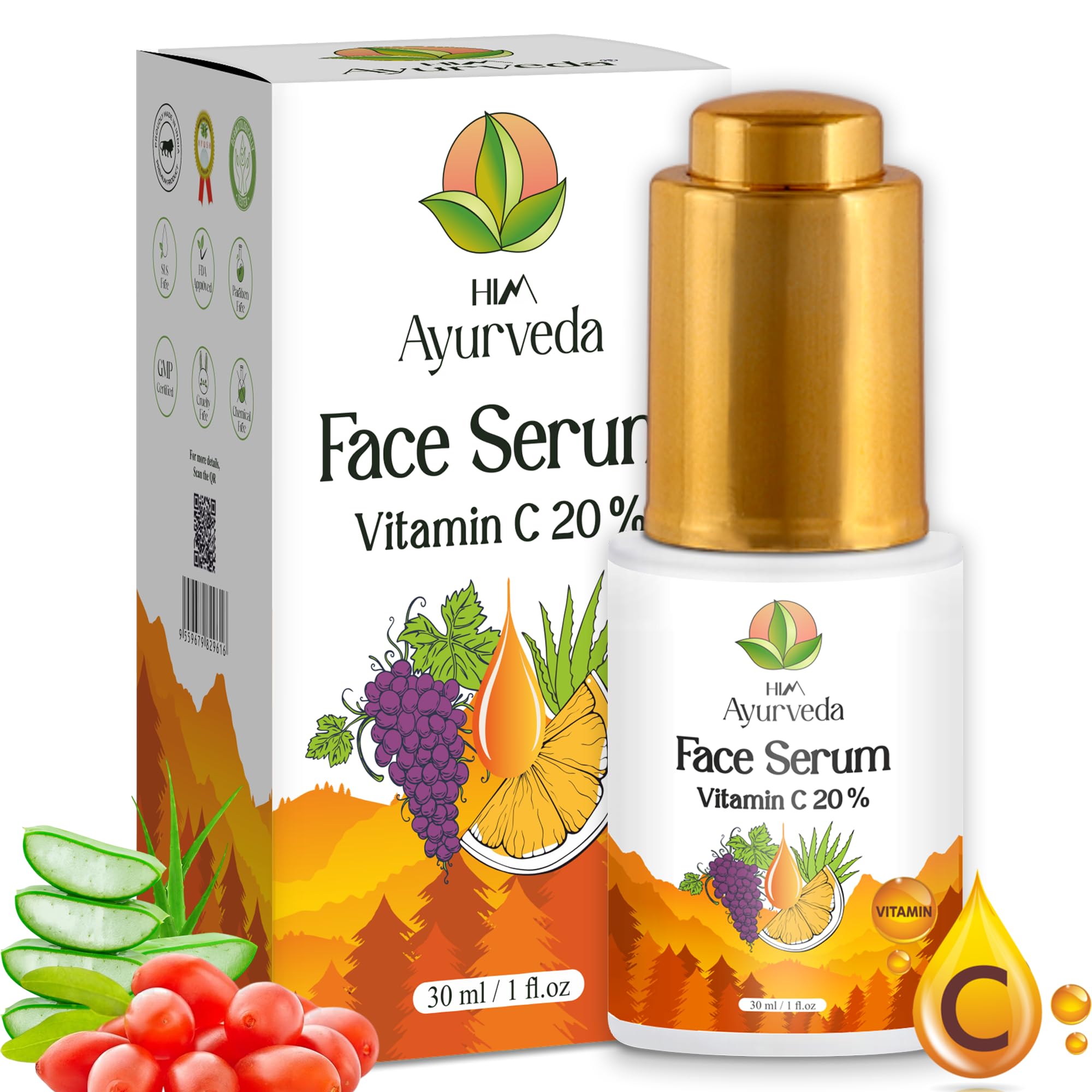 A healthy glowing skin has the most abundant protein in the body which is popularly known as collagen. It a speedy recovery against any skin damage. Nowadays with hectic lifestyle unbalanced diet pollution harmful UVA and UVB rays from the sunlight cause lower the production of collagen in the body. The ultimate solution to this is a good antioxidant serum. HIM AYURVEDA Vitamin C Serum has the ultimate amount of Vitamin C for the skin to maintain the skin elasticity and to fight against free radic. Free radicare the damaging molecules that is harmful for the inner and outer layer of skin. As per research to get a synergistic antioxidant effect in the perfect elixir Vitamin C should be combined with Hyaluronic Acid and Vitamin E. They together fight against all free radicand protect skin against the oxidation process. Other key ingredients such as Glycolic Acid exfoliates dead skin cells dissolves pigmentation marks Lactic Acid converts the dull skin into radiant skin and makes the skin supple Niacinamide s sensitivity s open pores Witch Hazel Extract tightens skin and Aloe Vera cleanses pores.