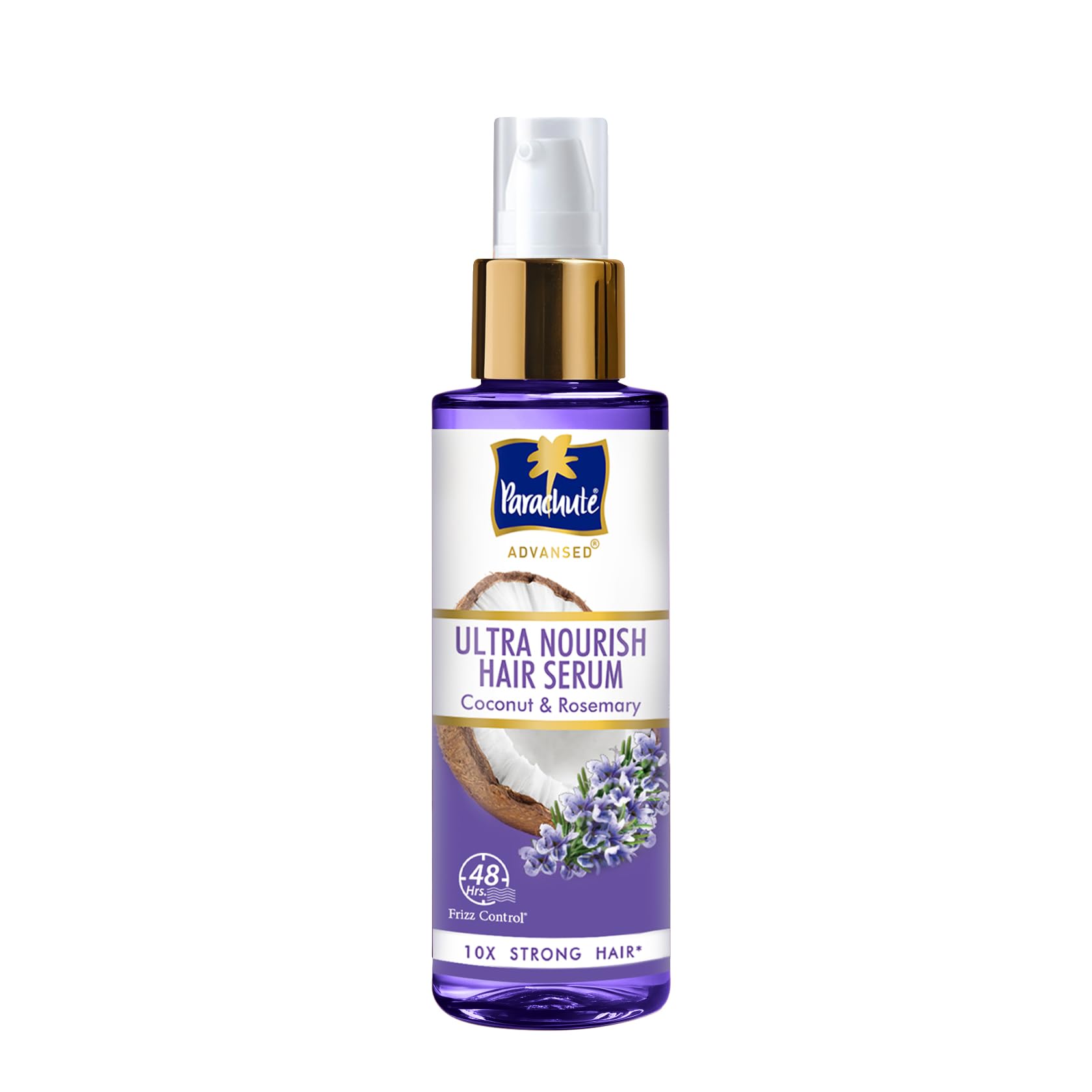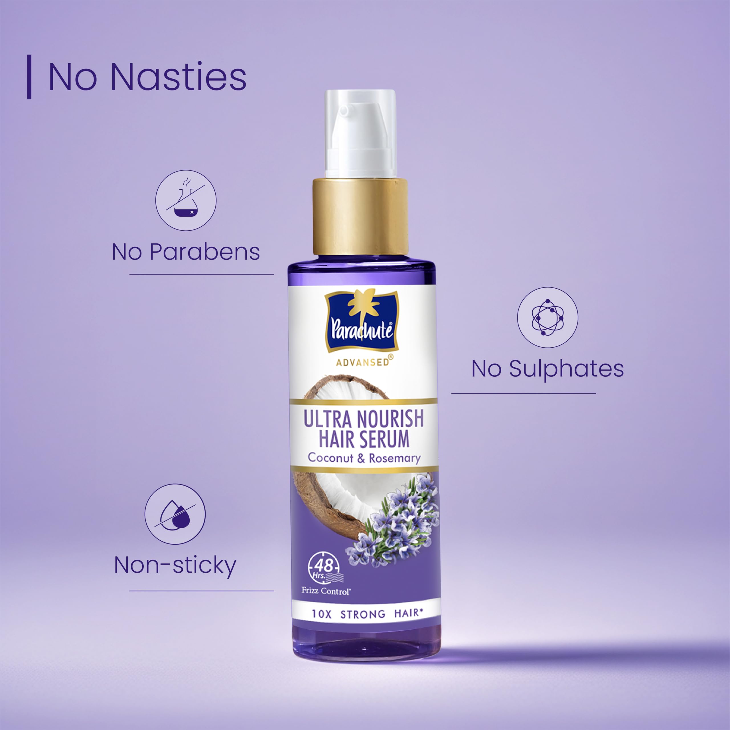 Packed with: Goodness of Coconut & Rosemary a powerhouse duo that nourishes strengthens and helps reduce breakage. This ultra nourish serum makes your hair healthy strong and beautiful. Keeps your hair: Extremely Nourished Healthy & Strong! Controls frizz for 48 hours.