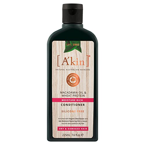 Strengthen and repair dry damaged hair with A'kin moisture rich macadamia oil & wheat protein conditioner; a deeply nourishing formula that rejuvenates from root to tip. Harnessing the powers of macadamia oil organic shea butter and wheat protein the creamy conditioner delivers weightless moisture and hydration whilst fortifying weak strands to leave them smooth and healthy from root to tip. Hair feels soft strong and cared for.