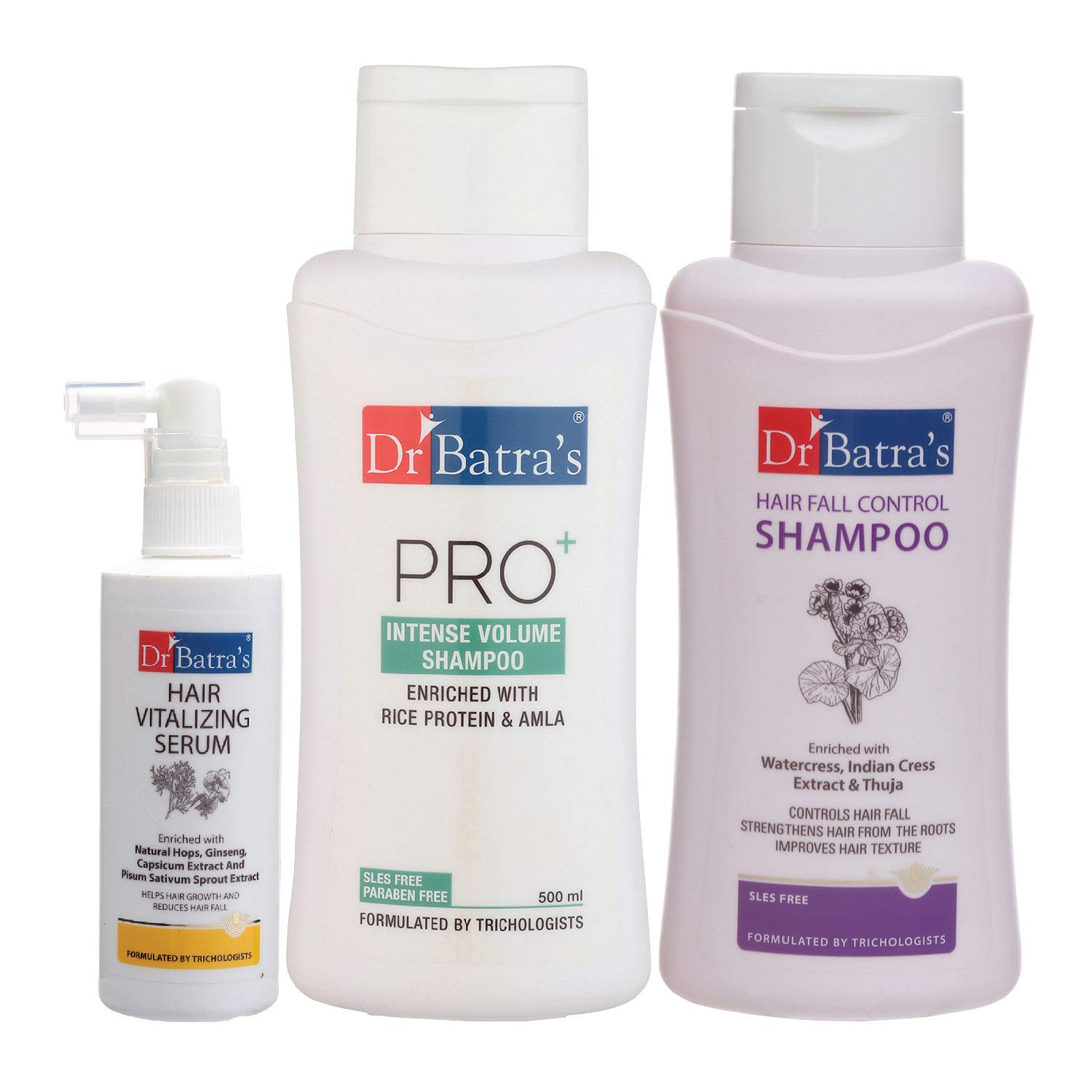 Dr Batra's Hair Vitalizing Serum is a blend of natural extracts like Thuja occidentalis which helps to inhibit DHT thus reducing the of hair . Hops rich in vitamins and amino acids help in hair growth. Dr Batra's Hair Fall Control Shampoo made with natural extracts is the best mild shampoo for hair fall control. Strengthened with Thuja occidentalis (white cedar) it helps to inhibit DHT thus reducing the of hair . Watercress & Indian Cress extracts strengthen the hair follicles from root to tip thereby arresting hair fall. Capsicum extract helps to accelerate the growth of new hair. Ginseng protects the scalp from the harmful effects of the environment. Enriched with Amla Dr Batra's Hair Fall Control Shampoo naturally conditions the hair to improve overall texture and provides nourishment from root to tip. It is free from paraben sulfate & silicon which makes it suitable for all types of hair. Dr Batra's Pro+ Intense Volume Shampoo made with natural extracts is one of the best shampoos to increase hair volume. Strengthened with Thuja occidentalis (white cedar) it helps inhibit DHT thus reducing the of hair fall. Rich in antiAmla extracts; cleanse the scalp and strengthen the roots to improve the overall hair texture. With the goodness of Rice protein this volumizing shampoo not only s volume but o enhances the giness of the hair making your hair look and feel healthier fuller and more nourished. It is free from paraben sulfate & silicon which makes it suitable for all types of hair.