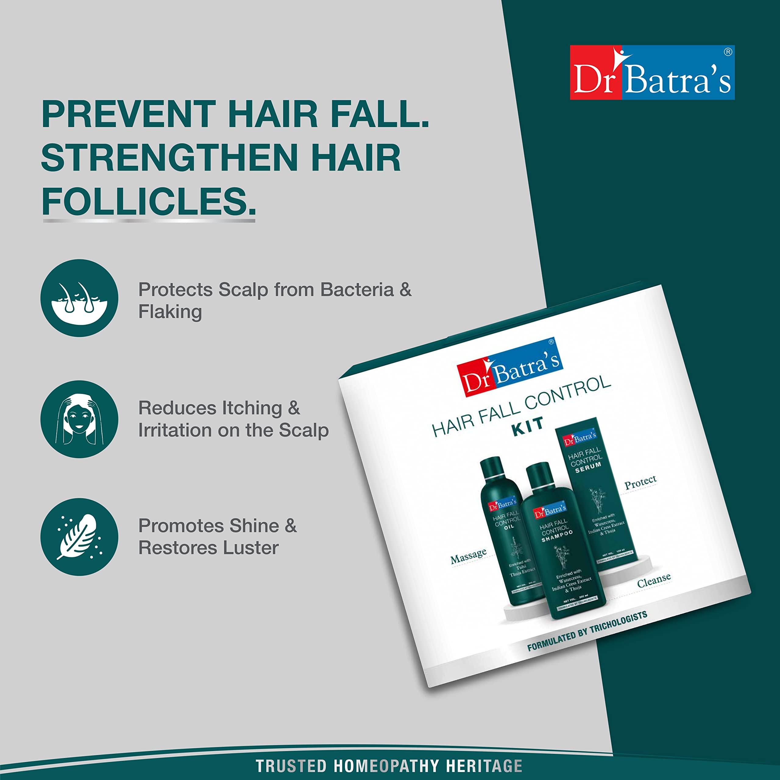 Dr Batra's hair fall control kit is brought to you by the house of ologists and is specially curated to take care of the daily nourishment of your hair. Infused with nature's best ingredients this 3-in-1 formula for hair fall caters to the needs of dull thin and brittle hair in just 3 easy steps. Dr Batra's hair fall control oil stimulates hair follicles Dr Batra's Hair fall control shampoo nourishes and cleanses and the anti-hair fall serum tames frizz and gives your hair the luster it needs. Key Ingredients: Dr Batra's Hair Fall Control Shampoo consists of essential ingredients like Watercress Indian Cress capsicum extract and Thuja that help maintain good hair. Directions to Use: Step 1: Gently massage Dr. Batra's Hair Fall Control Oil into the scalp for two minutes. Leave it on for a few hours or overnight. Step 2: Massage Dr. Batra's Hair Fall Control Shampoo into wet hair gently. Thoroughly lather and rinse. If desired repeat the process. Step 3: On the scalp apply Dr. Batra's Hair Fall Control Serum. Gently rub the serum in