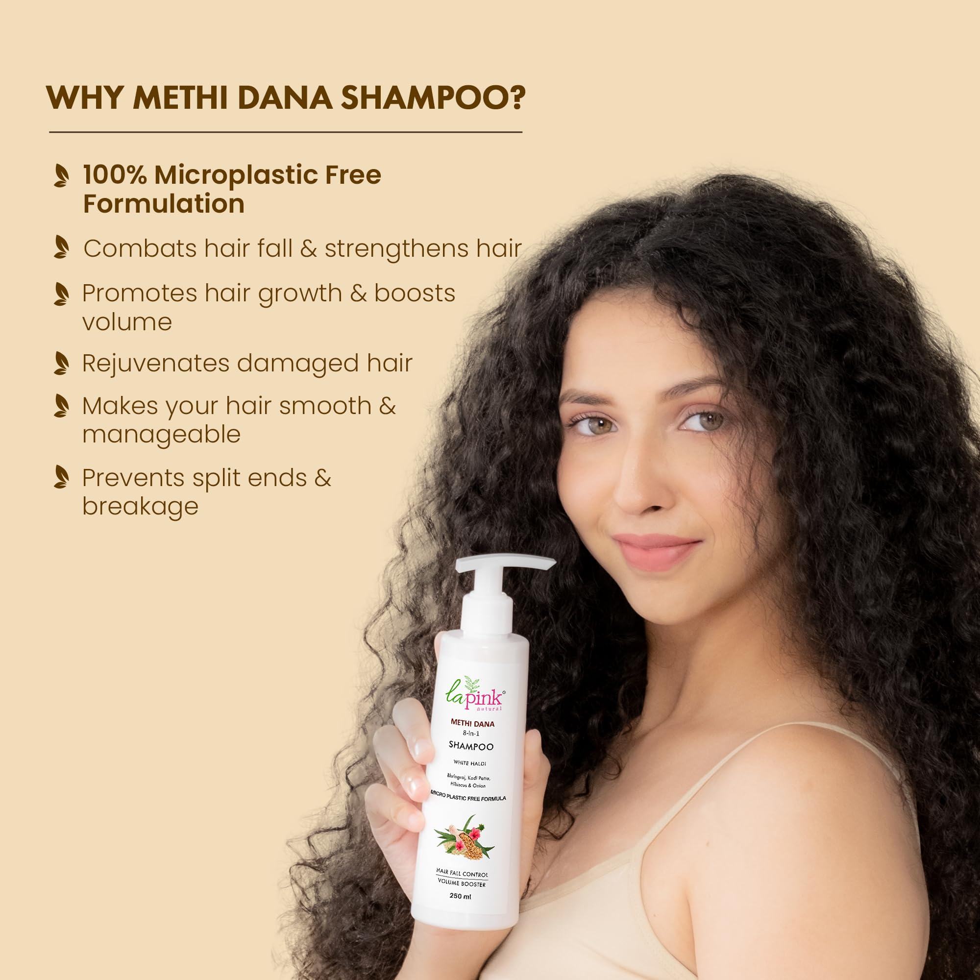 La Pink Methi Dana 8-in-1 Hair Fall Control Shampoo 250ml Reduces Hair Fall 100% Sulphate Free Makes Hair Healthy Stronger Longer & Boosts Hair Volume with Bhringraj Hibiscus Kadi Patta & Onion