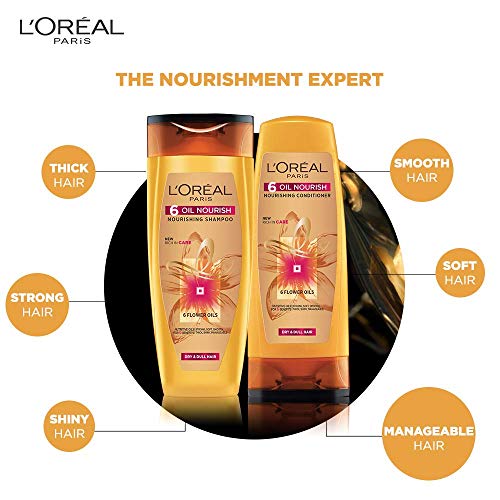 The 6 Oil Nourish Shampoo has been created to provide complete nourishment to your hair from root to tip with 6 Micro Oils making it soft shiny thick strong smooth and manageable.Science meets tradition with the infusion of 6 unique oils. The L'Oreal Paris 6 Oil Nourish Shampoo has been specially created by the L'Or al Research & Innovation Centre in India. It penetrates deep into the scalp giving it utmost nourishment and care that is suitable for all hair types.This shampoo comes with 6 Micro Oils to make your hair soft strong thick smooth shiny and manageable. Suitable for all hair types this shampoo penetrates into your scalp to make your hair beautiful.The 6 oil nourish shampoo has been created to provide complete nourishment to your hair from root to tip with 6 micro oils making it soft shiny thick strong smooth and manageable Science meets tradition with the infusion of 6 unique oils Massage gently into wet scalp/hair lather and rinse for soft nourished and healthy hair.