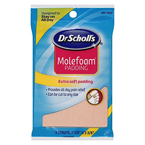 Dr Scholl's Molefoam Padding provides all-day relief of painful corns calluses and tender spots. Has extra soft dual-layer cotton and foam padding protects any part of the foot. Can be cut to any size. Helps prevent blisters. Has self-stick adhesive that holds padding in place. Won't "catch" on hosiery.