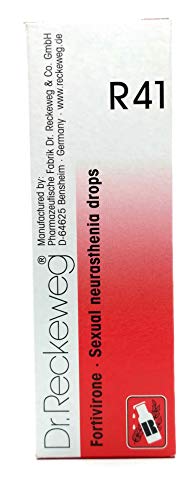 INDICATIONS Lack of vitality, Asthenia, spermatorrhoea, general debility especially in men. After-effects of debilitating illnesses, overwork on physical or other planes, overexcitement, nervous exhaustion. Against various kind of ailments in old-age. MODE OF ACTION OF MAIN INGREDIENTS: Tissues grow old through a variety of causes. The formation of rings can be noticed in the albuminous molecules bringing about a rarification of water and consequent parching.As these albuminous molecules loose their working efficacy they can no longer fulfil their detoxicant role towards the cells. This in turn means an accumulation of harmful tissues. It is through a homoeopathic medication stimulating the etoxicant cellular mechanism that an outward bound elimination of these toxins is achieved. The composition of R41 has been adapted in such a way as to influence the different systems, with special emphasis on the vitality glands. It is universally admitted that the function of the germinal glands affects the whole life-current in an individualOther indications in accordance with the following symptomatology.Acidum phosphoricum: Tonic in case of impotence and lack of libido.Agnus castus: Lack of vitality; weakness , with high efficacy in low dilution.China: Specific effect in cases of disturbances after debilitating illnesses.Conium: Angry irritations, lack of concentration. Hypochondria and in senile debility.Damiana: Strengthens the genital regions.Phosphorus: Lack of power. Irresistible desire, involuntary emissions with lascivious dreams.Sepia: Acts in cases of exhaustion of all cellular functions, fatigue, aversion, repugnance for coition.Testes: Acts as substitute and stimulant in the organotherapeutic sense. DOSAGE - Generally 2-3 times daily 15 drops in a little water before meals. In cases of long standing and to achieve a more rapid result, for 2-3 days 10-15 drops can be taken every 1-2 hours.