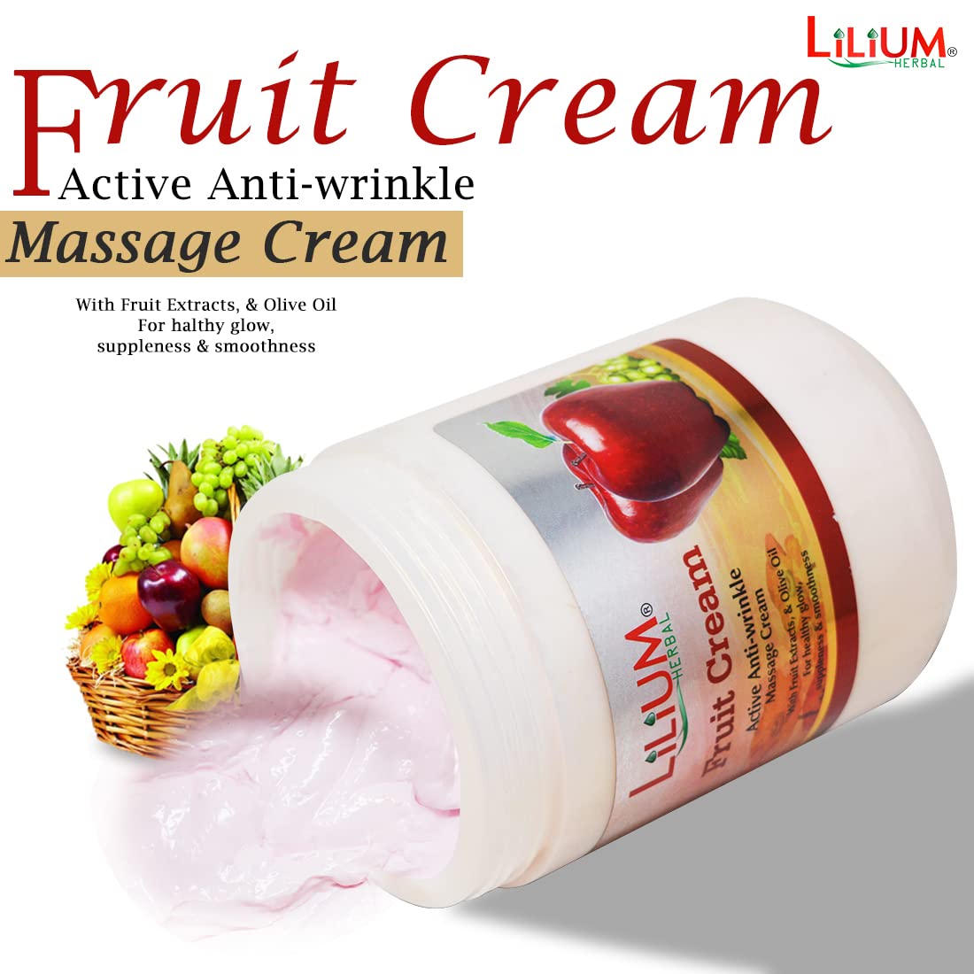 Fruit Massage Cream A unique blend of aroma oil natural herbs and fruit extract containing fruit which protects the skin from environmental damage and dryness It is enriched with apple orange papaya & kokum butter which reduces skin wrinkling makes skin soft & supple and removes dark patches. It improves skin complexion makes skin glowing and more bright maintains the natural elasticity of the skin promotes blood circulation to keep the skin healthy and natural fruit.