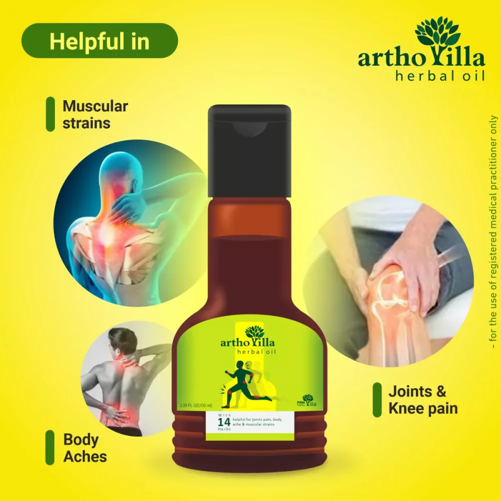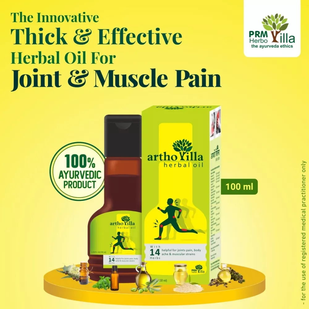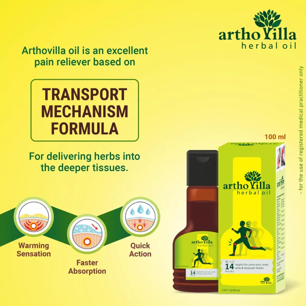 Arthovilla Oil is is an ayurvedic joint pain relief oil created using 14 oil like Mahamash Oil, Mahanarayan Oil, Mahavishgarbh Oil, Malkagni Oil, Nirgudi Oil, Gandhpura Oil, Til oil and many more. Arthovilla oil is an excellent pain reliever based on transport mechanism formula for delivering herbs into the deeper tissues, when applied the oil deeply penetrate the affected tissues through the healing properties of the herbs used in the formulation. It effectively gives relief from knee pain, joints pain, rheumatic pains, frozen shoulder, muscle cramps backache, and swelling. Arthovilla Oil provides long lasting relief that lets you live a pain free lifestyle.