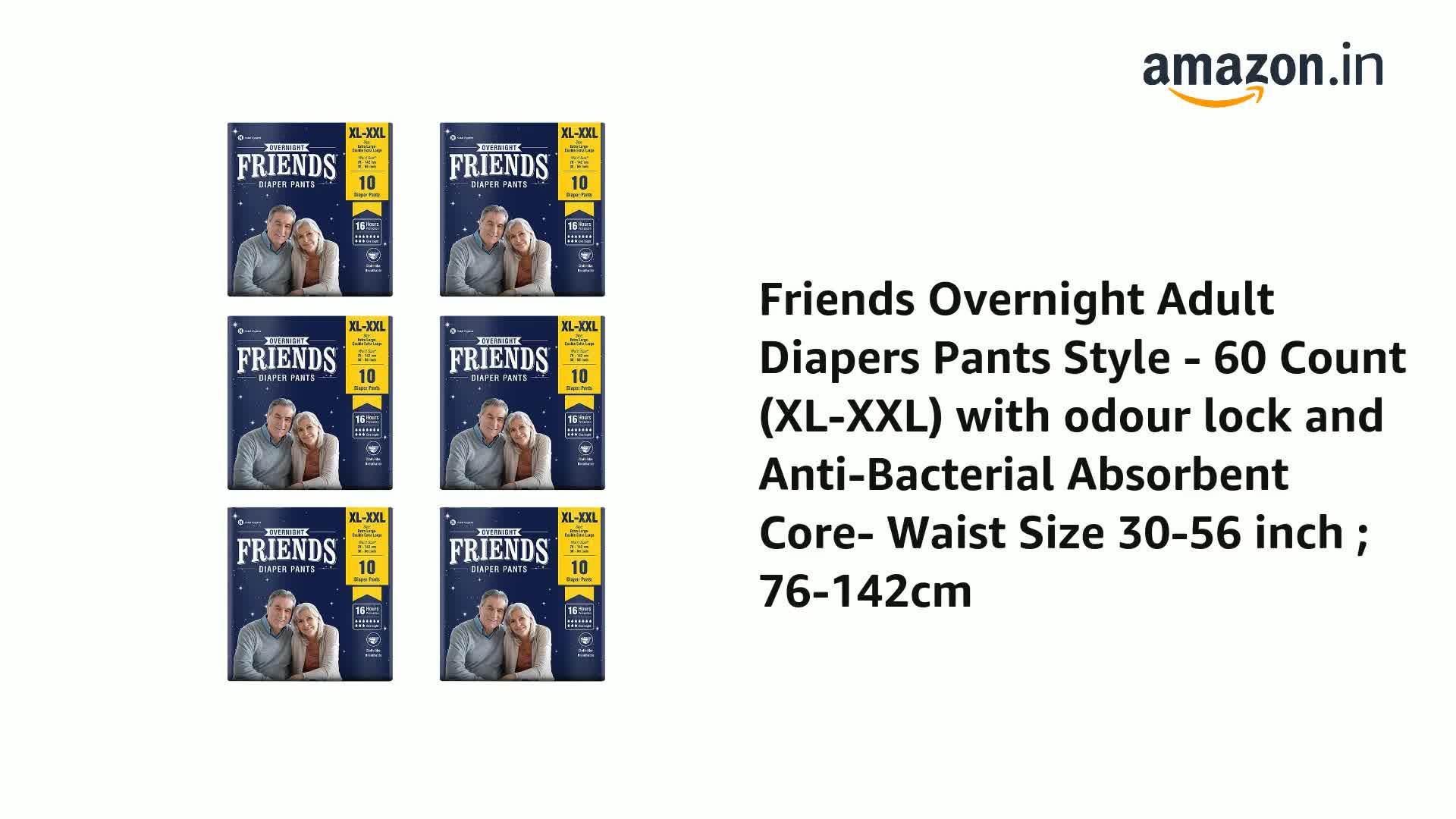 Friends Overnight Adult Diapers Pants Style - 60 Count (Extra Large) with odour lock, Unisex, Leakproof, Elastic Waist and Anti-Bacterial Absorbent Core - Waist Size 30-56 Inch; 76-142 cm