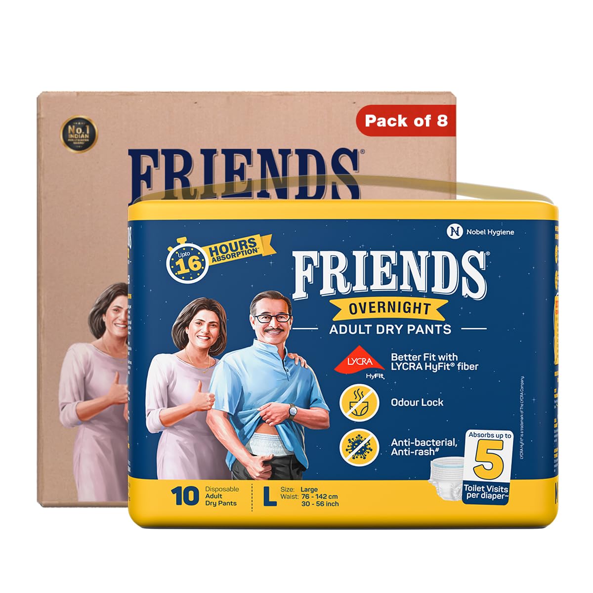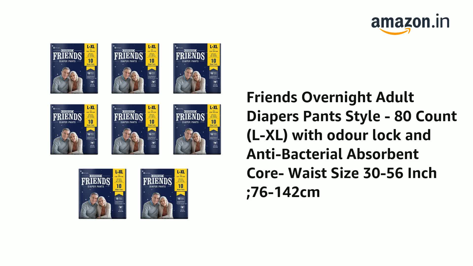 Friends Overnight Adult Diapers Pants Style - 80 Count (Large) with odour lock, Unisex, Leakproof, Elastic Waist and Anti-Bacterial Absorbent Core - Waist Size 30-56 Inch; 76-142 cm