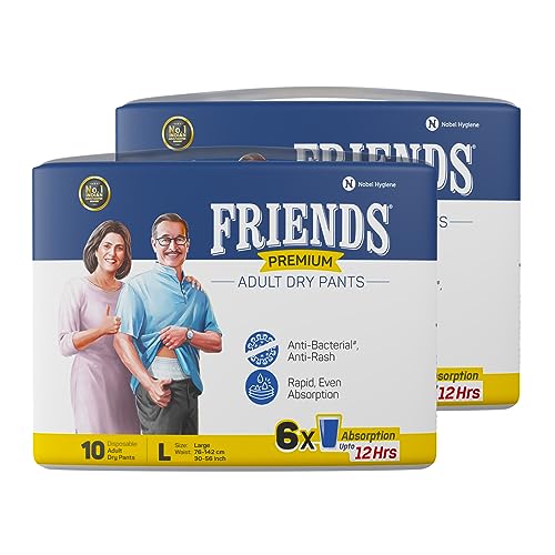 Friends Premium Adult Diapers Pants Style - 20 Count (Large) with odour lock, Unisex, Leakproof, Elastic Waist and Anti-Bacterial Absorbent Core - Waist Size 30-56 inch; 76-142 cm