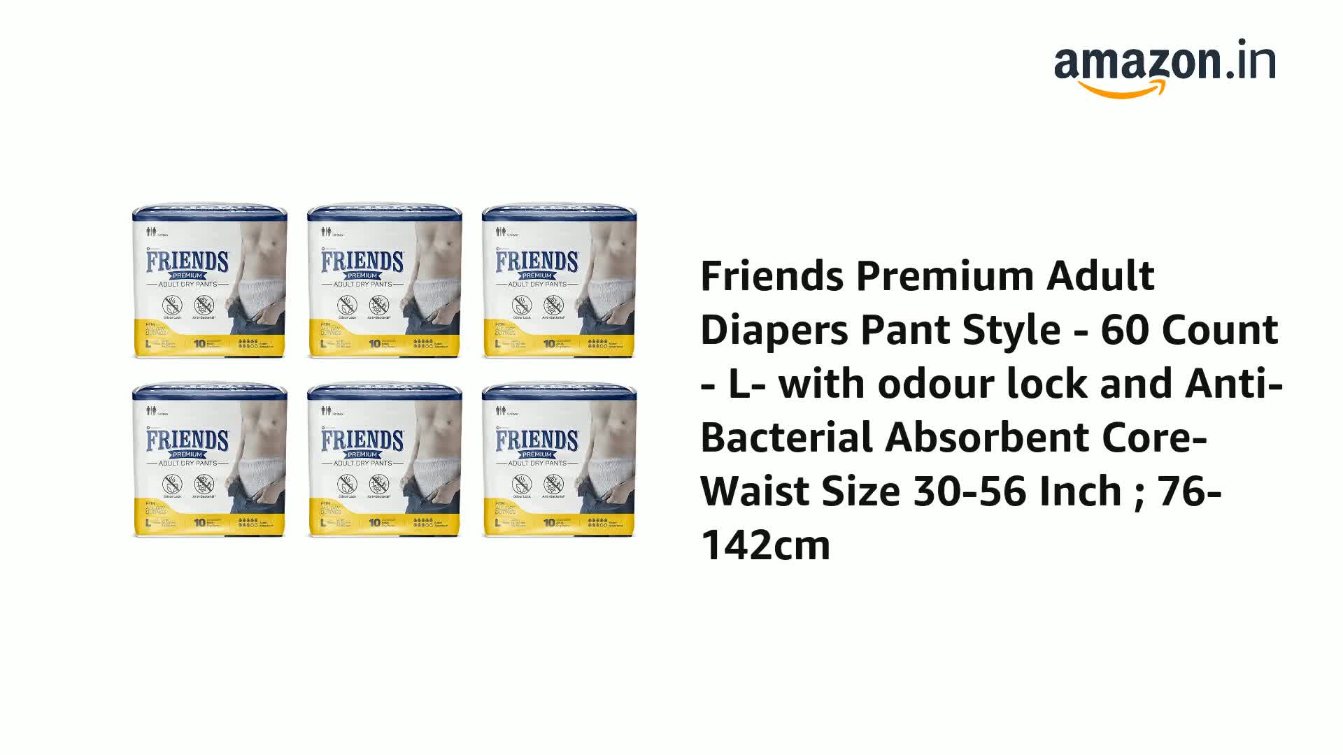 Friends Premium Adult Diapers Pants Style - 60 Count (Large) with odour lock, Unisex, Leakproof, Elastic Waist and Anti-Bacterial Absorbent Core - Waist Size 30-56 inch; 76-142 cm