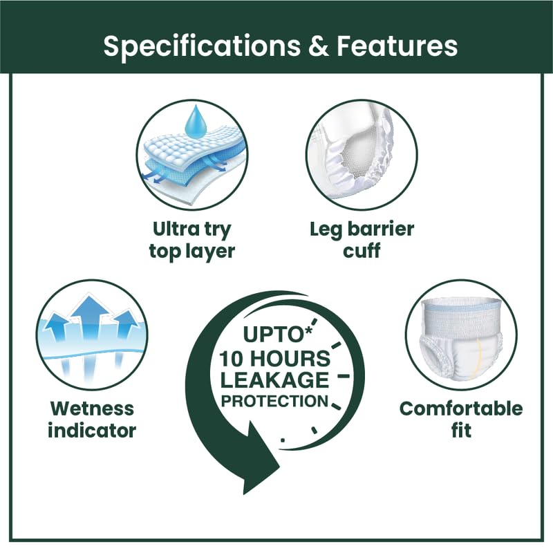Up to 10 hours of leakage protection and is cottony soft. Quick absorption with an ultra-dry top layer. Odour lock and wetness indicator