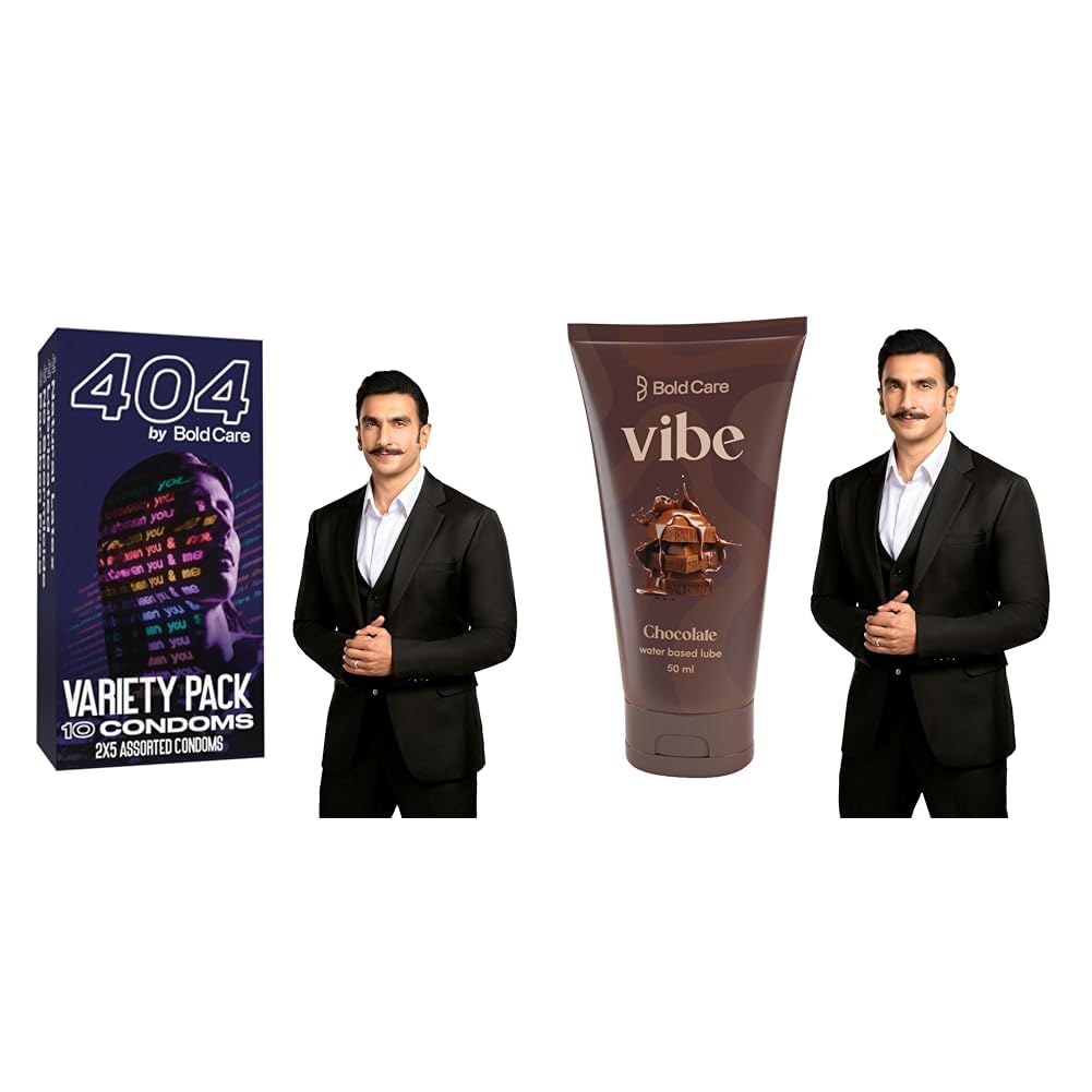 Bold Care Vibe Water Based Lubricant (Chocolate For Men and Women) + 404 Variety Pack Condom Combo