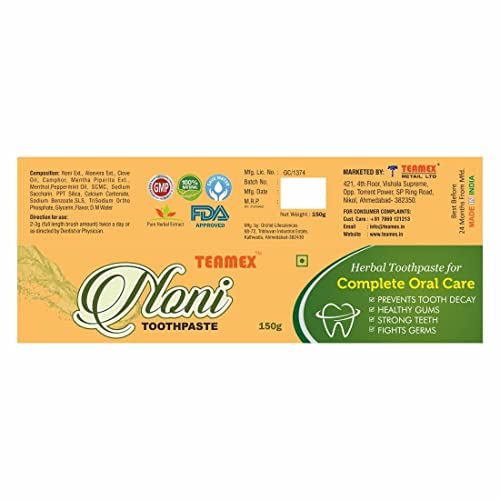 Noni Toothpaste With Aloe Vera A Complete Ayurvedic Oral Care Pure Herbal Natural No Chemicals - Protect Enamels Strengthens Gums Reduce Plaque Pack of 1 150g