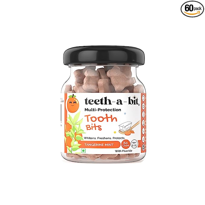 Teeth-a-bit tooth bits for are worlds first toothpaste in exciting shapes and figurines to keep the excited about their oral health. Made with 100% natural flavours- plant-based real fruit extracts like Strawberry, Tangerine, Cherry, Vanilla. 100% Natural Strawberry Extract and Flavor, 100% Natural Cherry Vanilla Extract and Flavor, 100% Natural Tangerine Extract & Flavors, 100% Natural Menthol, 100% Natural Salt, Non-GMO Xylitol Sweeteners. Our Deserve Zero that is Zero Alcohol, Zero Water, Zero Artificial Flavors, Zero Artificial Colors, Zero Peroxide, Zero Dyes, Zero SLS, Zero Parabens, Zero Plastic, Zero Spills, Zero Leaks, Zero Cruelty tooth care products. The multi-protection toothpaste bits are formulated with anti-gingivitis anti-stain anti-tartar multiprotection proprietary waterless formula. Lesser abrasive herbal toothpaste formula for still developing primary teeth. Teeth Whitening, Enamel Builder, Anti-Rich with polyphenols and flavonoids. 500 PPM of Max Available oride. Love it, Cavities Dont! Simply Krush Karo, Brush Karo - Sanitary and Perfect Dose every time! No guesswork, No Over or Under Use. No more worry about spills or leaks. Crush or Chew 1 toothpaste bit with front teeth, forming a soft creamy paste. Wet your toothbrush and brush in gentle circular motion for 2-3 mins, spit out, rinse and done. Now can replace that clunky leaky liquid toothpaste tube or messy tooth powder by just popping a toothpaste tablet in your mouth! Keep Smiling, Keep Shining!