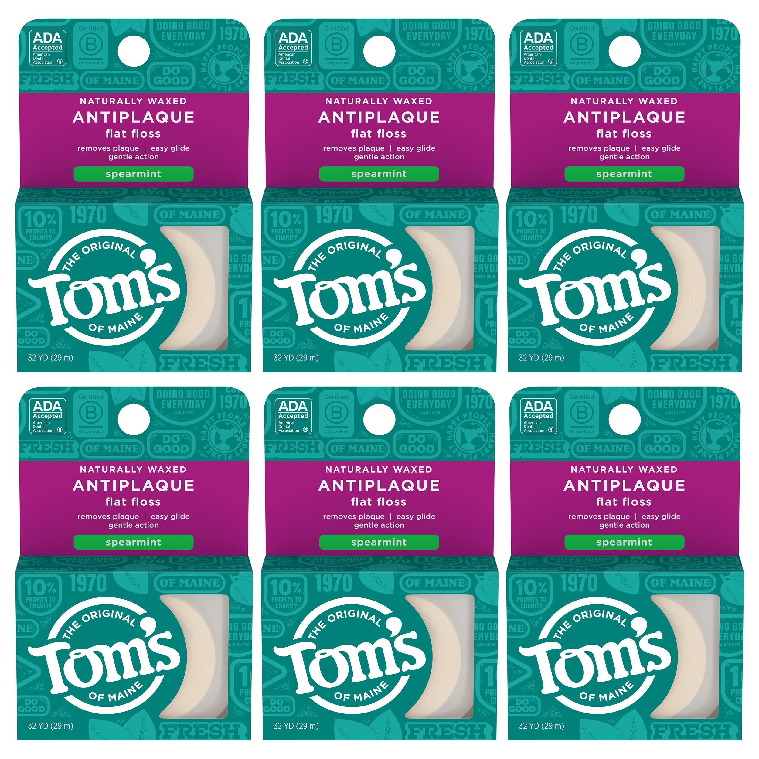 Strong between teeth. Gentle on gums. Tom's of Maine Naturally Waxed Antiplaque Flat Floss contains naturally waxed nylon filaments so you don't have to worry about snapping or fraying. Use this floss to thoroughly and efficiently remove plaque and food particles for healthy teeth and gums. Want to perfect your technique? Grasp 18 inches of dental floss and wrap around middle fingers. Gently work between each tooth to just below the gumline. Disrupt the plaque by sliding the floss in a "C" shape against the surface of the tooth. Then repeat daily for happy teeth and gums. At Tom's of Maine we want to empower families to live more naturally. With more than 50 years experience combining scientific know-how naturally derived ingredients and a bit of ingenuity we make products that are good for you and the planet. As a Certified B Corp we hold ourselves to the highest social and environmental standards. Plus we're committed to supporting local communities for meaningful change donating 10% of our profits to charities supporting health education and the environment. We call this "doing good for real" and it impacts everything we do.