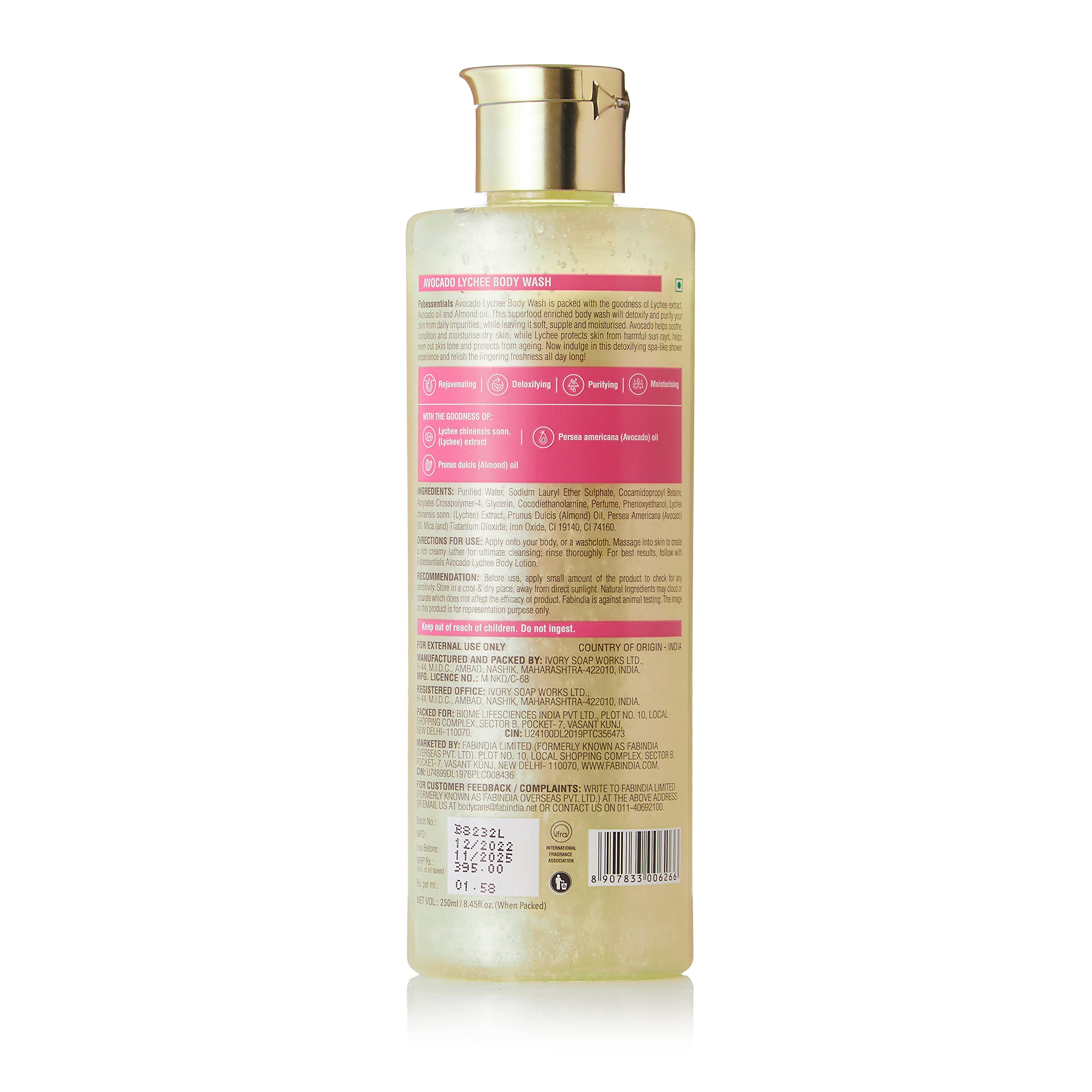 fabessentials Avocado Lychee Body Wash is packed with the goodness of Lychee extract Avocado oil and Almond oil. This superfood enriched body wash will ify and purify your skin from daily impurities while leaving it soft supple and moisturised. Avocado helps soothe even out skin tone and protects from ageing. Now indulge in this ufying spa-like shower experience and relish the lingering freshness all day long!