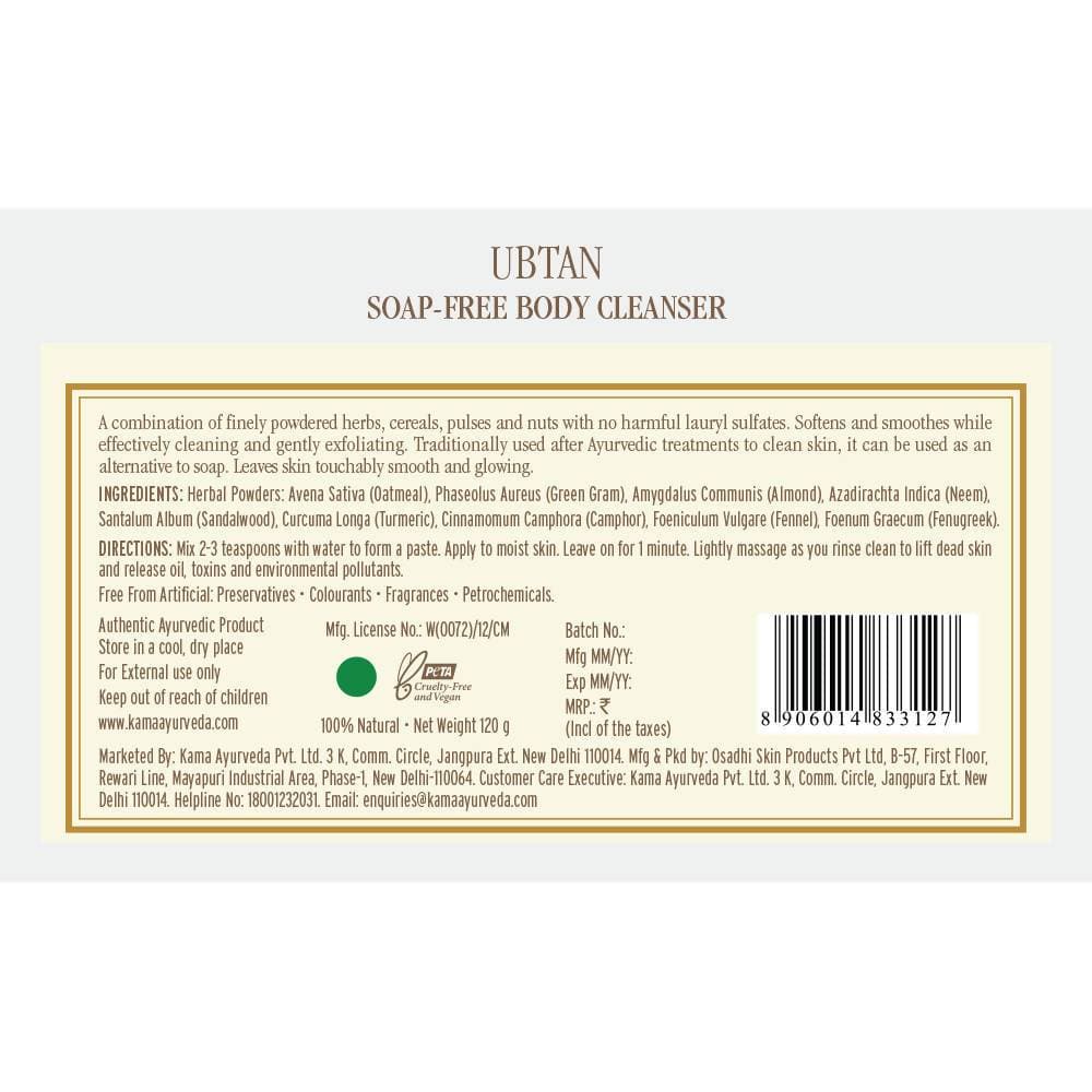 Kama Ayurveda Ubtan Soap Free Body Cleanser 120gmA non-drying, daily body cleanser packed with natural nutrients that gently clean and exfoliate for fresh and healthy skin. How to use: Mix some powder into hand with water to make a wet paste. Apply to moist skin. Lightly massage with circular motions and rinse clean to lift dead skin and release oil, toxins, and environmental pollutants. This invigorating body cleanser is packed with essential herbs and minerals so as to promote healthy and fresh skin. Traditionally used after Ayurvedic treatments to clean skin, it can be used as an alternative to soap. A combination of finely powdered herbs, cereals, pulses and nuts with no harmful laurel sulphates, this formula softens and smoothes while effectively cleansing and exfoliating. Amongst its many powerful ingredients are Oatmeal, Green Gram, Almonds, Neem, Turmeric and Fennel. Regular use will balance and retexturise the skin helping reduce the appearance of cellulite. Warming and stimulating, it leaves you feeling alert and refreshed with skin that is noticeably smoother and glowing.Benefits100% NaturalNon-foaming and non-dryingCleanses and exfoliatesEvens skin toneSmoothes and softensReduces apparance of celluliteSuitable for sensitive skinDisclaimer: The product is guaranteed to be 100% genuine. Product images are for illustrative purp