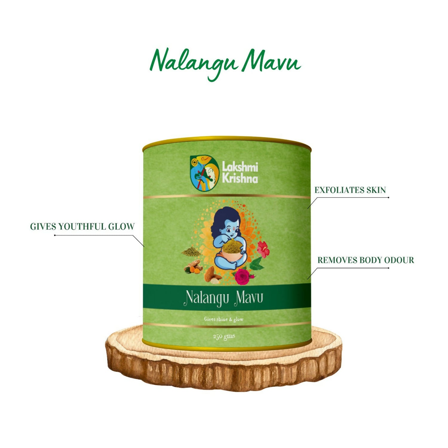 Lakshmi Krishna Naturals Nalangu MaavuProduct Description:Lakshmi Krishna Naturals Nalangu Maavu Bath Powder is a lifesaver for those suffering from acne, dryness, irritation, aging, and fine lines.This Herbal Bath Powder helps in achieving clear and evenly toned shiny skin. This Bath Powder is perfectly customized for all types of skin tones and consists of a combination of natural Ayurvedic ingredients like Green gram dal, Kasturi manjal, Rose petals, Avarampoo, Vetiver, Hibiscus, Bengal gram dal, White Turmeric and neem which gives you the perfect Shine & Glow to the skin.Key Ingredients:Green Gram Dal, Kasturi Manjal, Rose petals, Avarampoo, Vetiver, Hibiscus Flower, Bengal gram dal, White Turmeric, Neem leafHow to Use:Step 1: Take a small amount of Nalangu Maavu powder in a bowl and add a water or milk to that powder to make a thick paste.Step 2: Apply the paste over face and neck and body.Step 3: Wait 15 to 20 min until its dry after Rinse off the paste thoroughly with warm water.Legal Disclaimer: Product images are for illustrative purposes only. Images/packaging/ labels