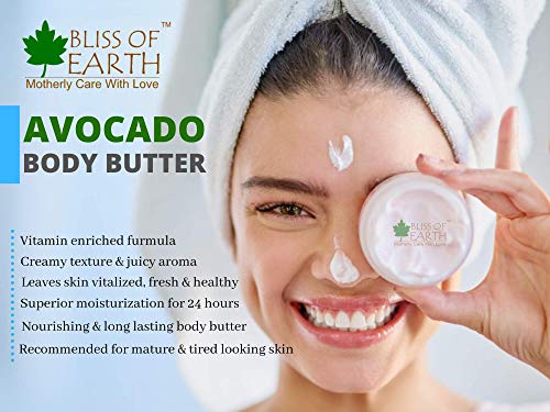 Add an extra dose of pleasure to your daily care rituals with Bliss of Earth Avocado Body Butter a nourishing long lasting butter ideal for use on specific areas or to moisturize the entire body. Our body butterocreamy texture and juicy aroma makes it simply irresistible. It is an irreplaceable product after showering as it provides superior miniaturization for up to 24 hours and leaves your skin feeling vitalized fresh and healthy. Our vitamin-enriched formula for the body promotes cell regeneration and helps preserve skinoelasticity. Avocado body butter is especially recommended for mature and tired-looking skin.